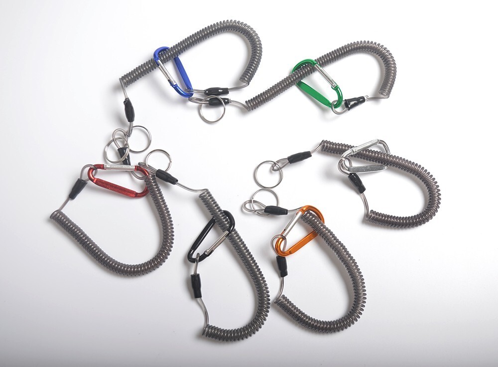 【送料無料】ワイヤー芯入りスパイラルコード6本セット アルミカラビナ付き キャンプ道具 工具等の落下防止に カールコード 尻手ロープ