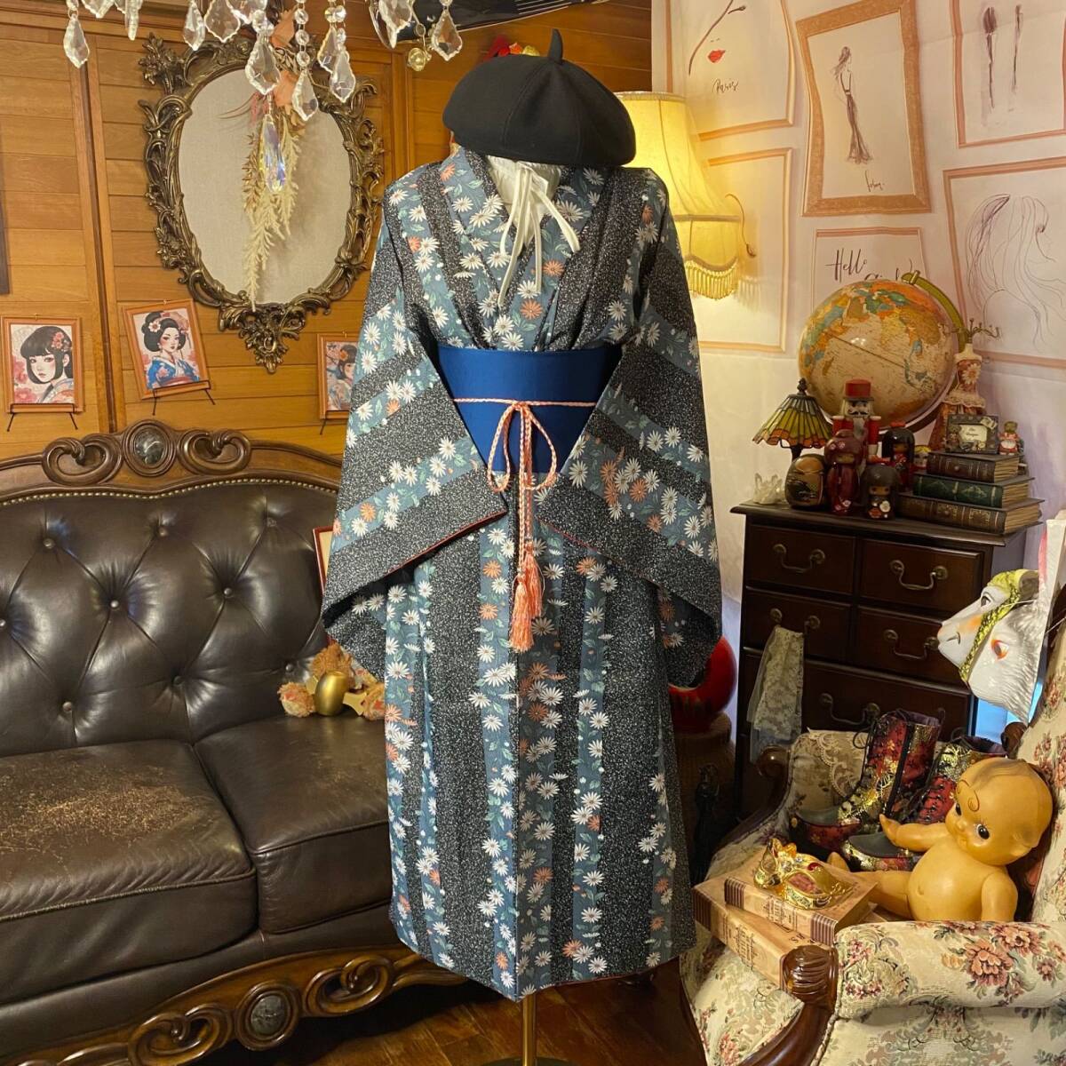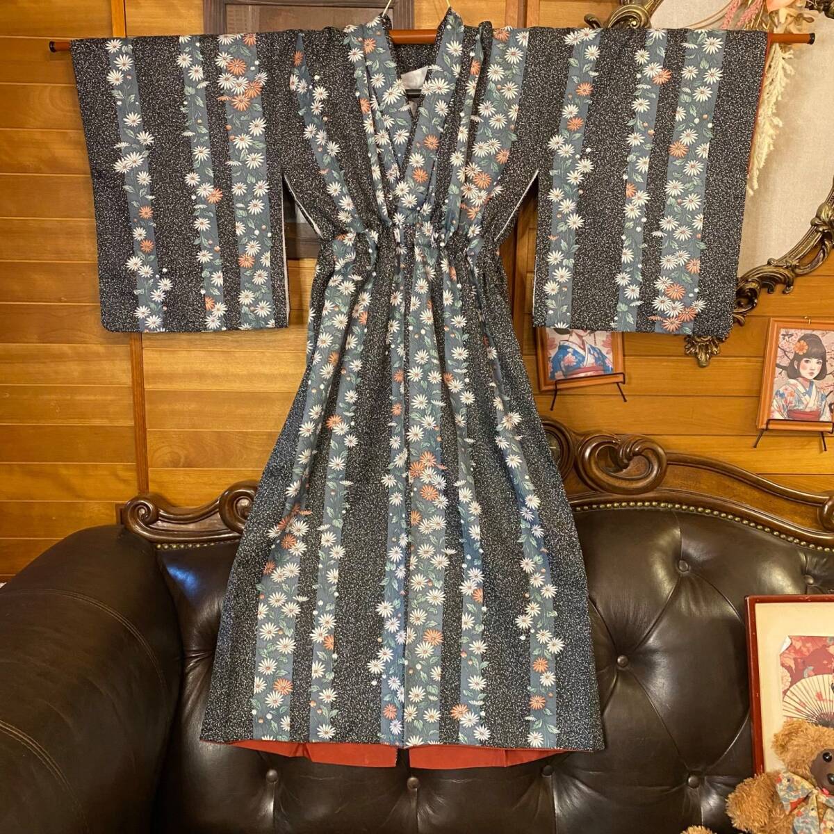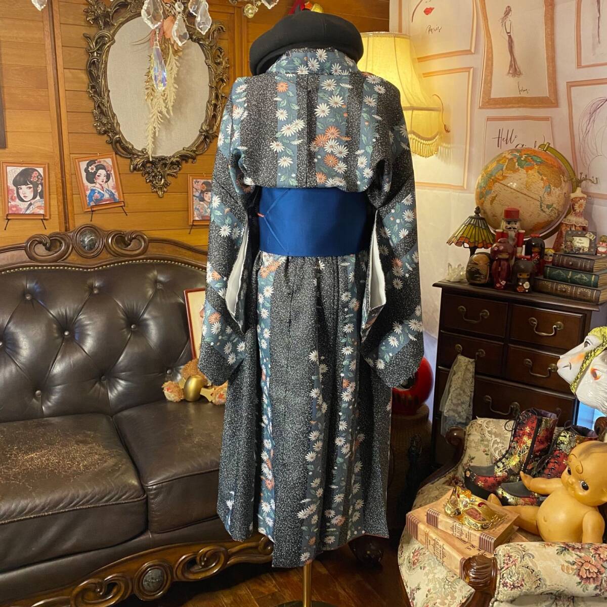【着物リメイク セミロング ワンピース|洗える化繊素材&帯サッシュベルト付き レトロ 古着 ハンドメイド ブルーグレーに小菊〈デイジー風〉 KW-1078】