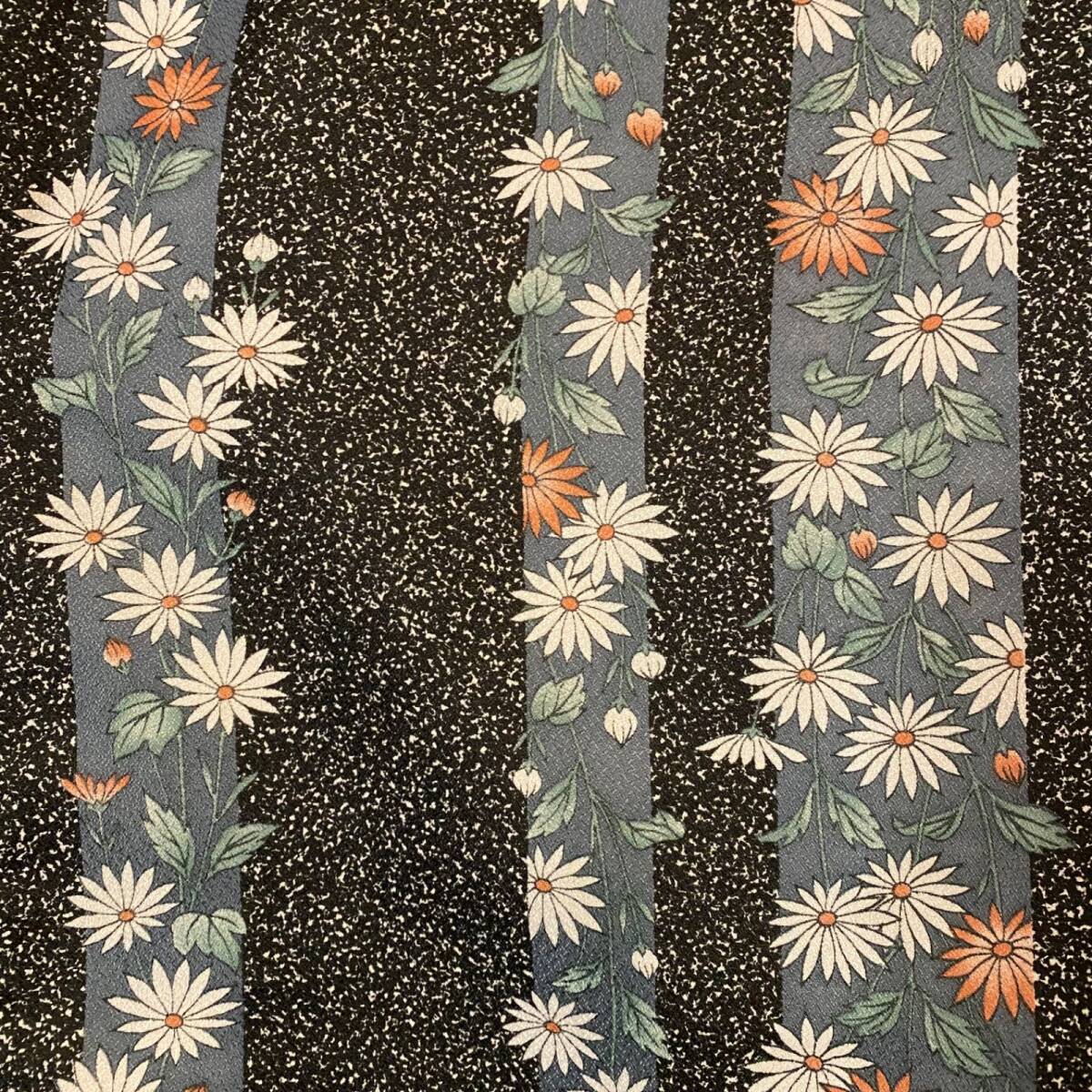 墨黒に白を細かく散らした霰調の縦段と、ブルーグレーに小菊〈デイジー風〉がつらなる縦段が交互に走るストライプ。