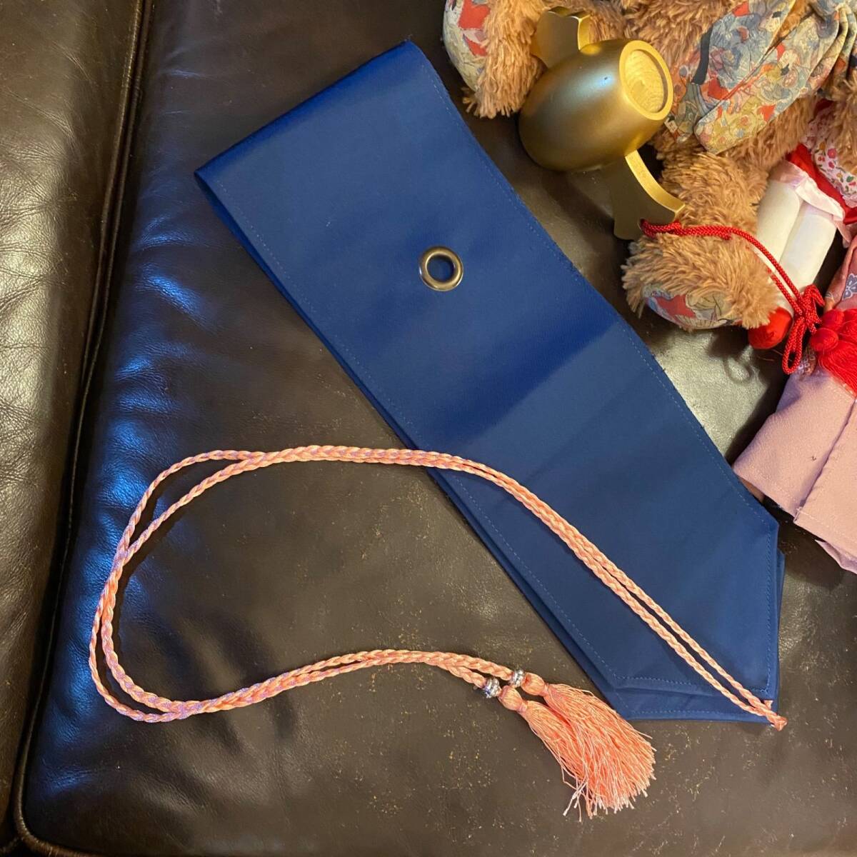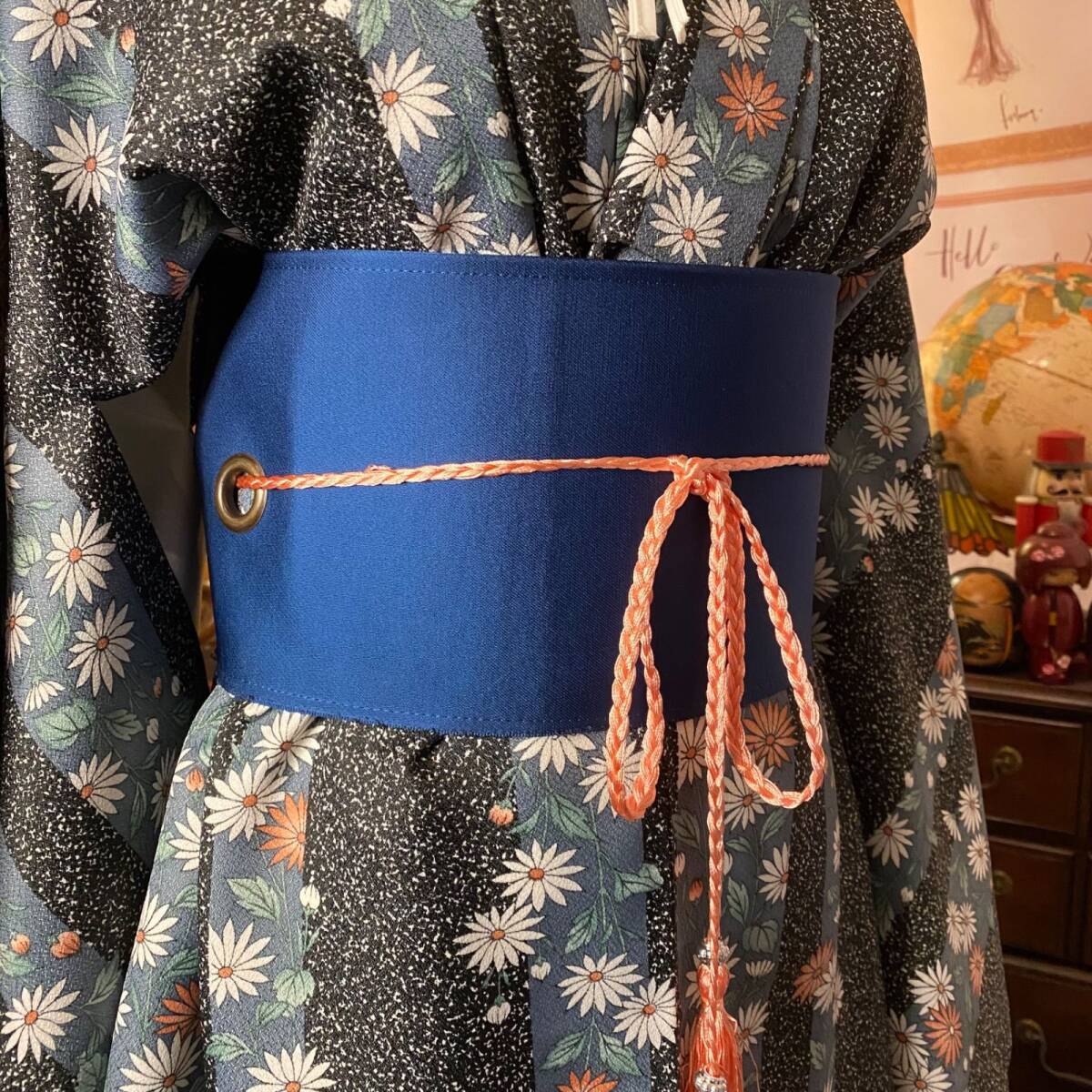 合わせの帯ベルトは群青寄りのブルー。コーラルピンクのタッセルコードをきゅっと結べば、装いがきりりと引き締まり、花柄の愛らしさが一段と映えます。