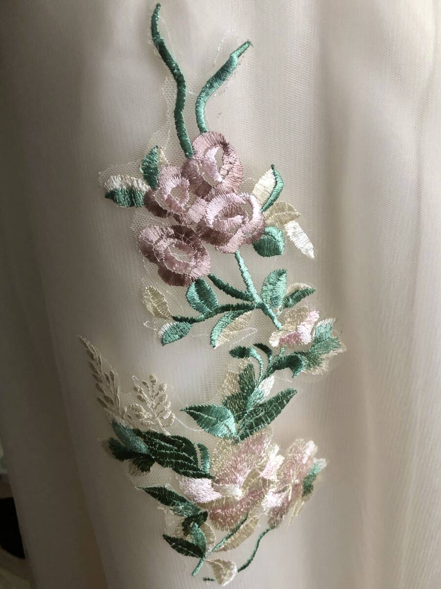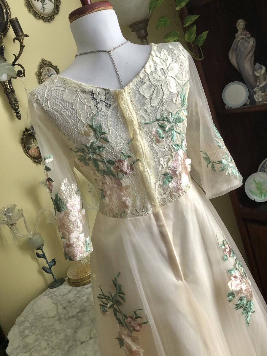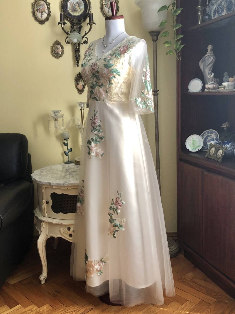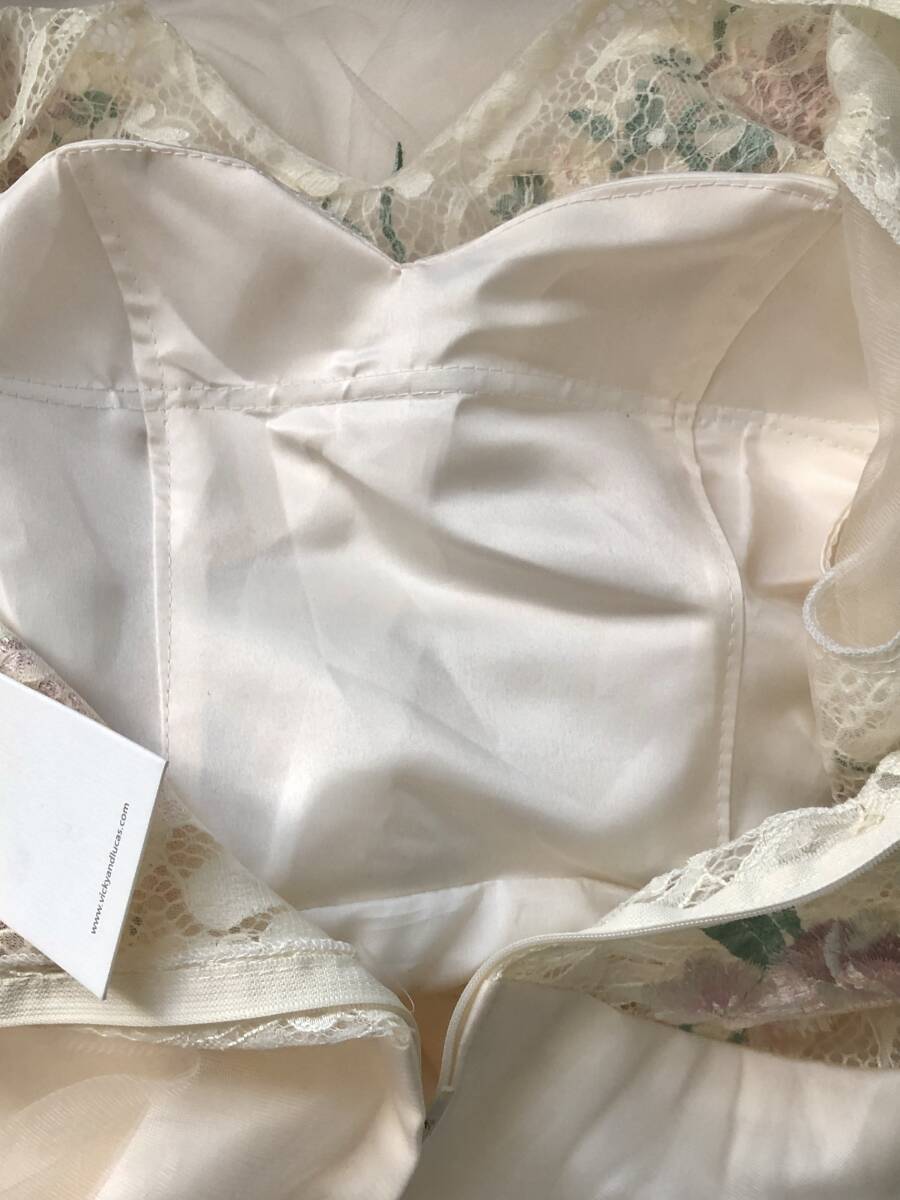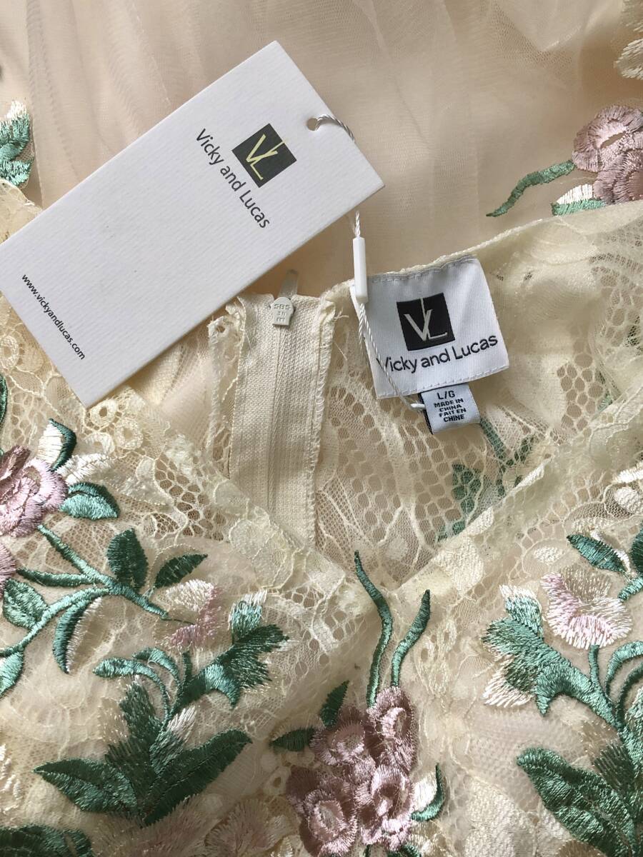 【Vicky and Lucas】より、素敵なイブニングドレスです。 シャンパン色のドレスに刺繍がとても綺麗です。 ふんわりとした二重のチュールスカートも素敵ですね。 張のあるサテンの裏地が付いています。 ブラパットが付いてブラなしでご着用頂けます。 スカートは張りがあってボリュームが出ます。 サテンの裏地が付いています。 後ファスナーで開きます。 【状態】新品 【ブランド】Vicky and Lucas 【サイズ】表示サイズ/ US(アメリカ)L 日本対応サイズ目安/ 15号サイズぐらい *個人差がございます。必ず採寸をご参照ください。 【採寸】平置き採寸です。 肩幅40cm、身幅50cm、ウエスト42cm、着丈144cm(上身丈39cm+スカート丈105cm) 【カラー】シャンパン色 【素材】ポリエステル100% 【裏地の素材】ポリエステル100% 【着脱】後ファスナー