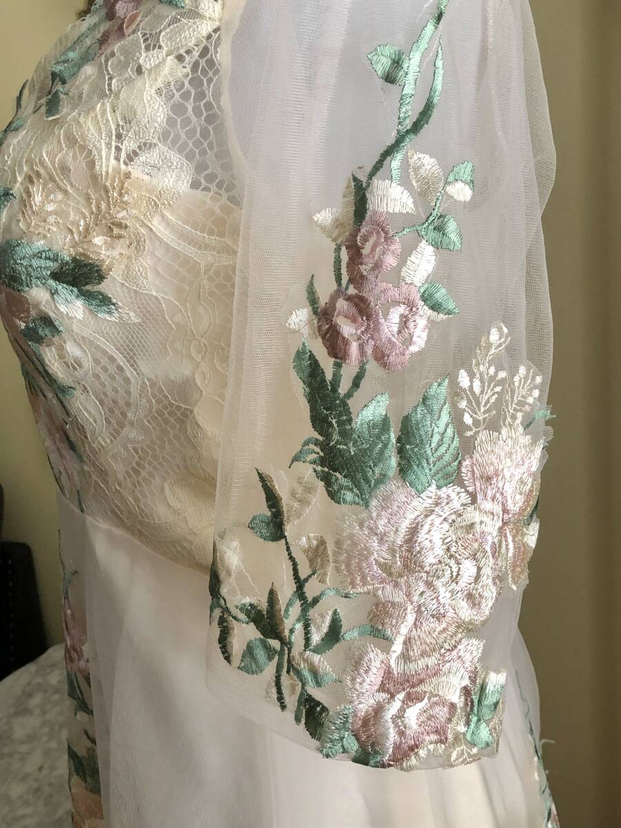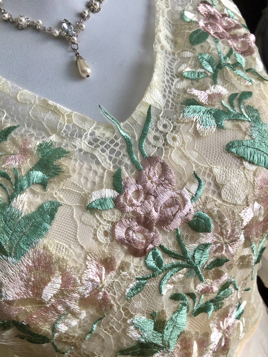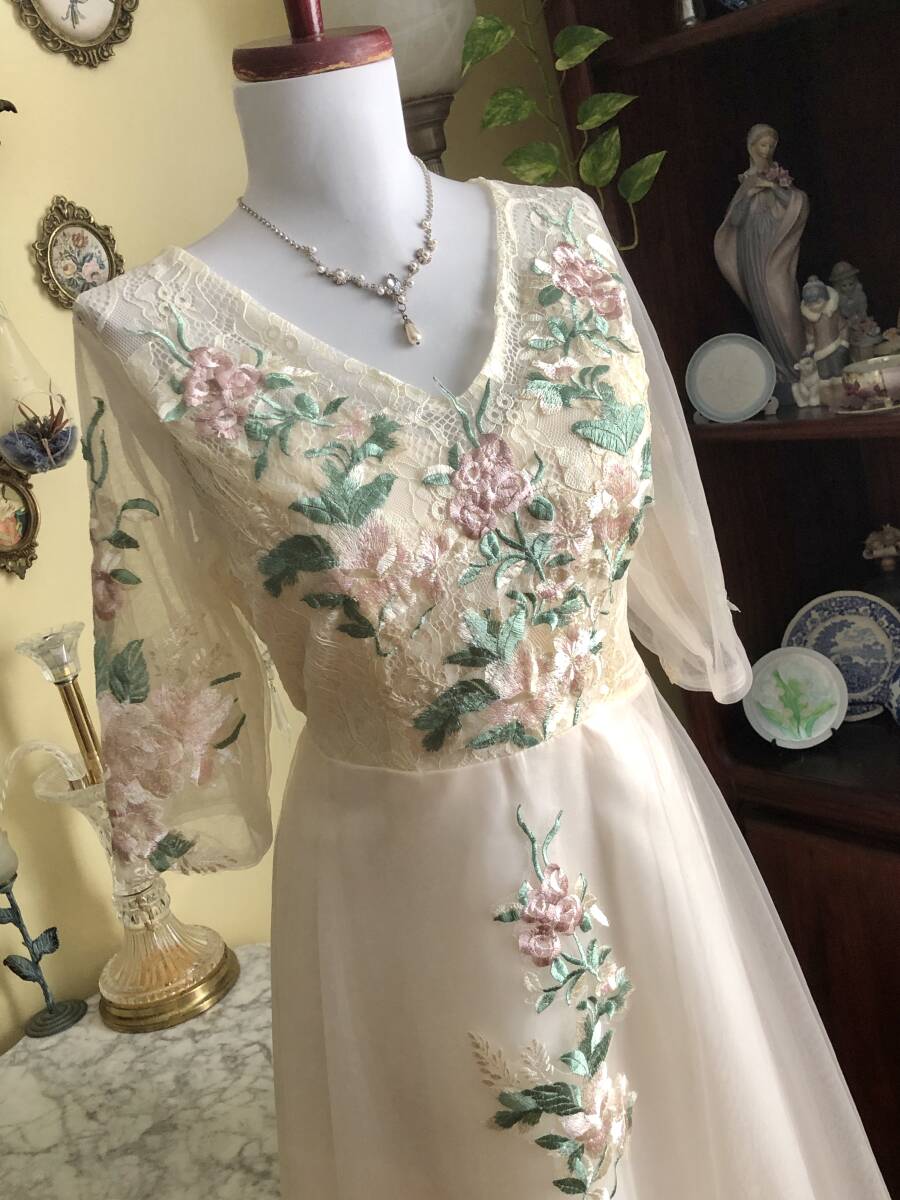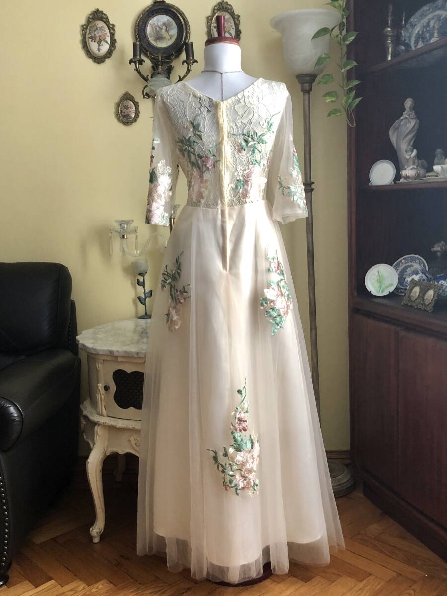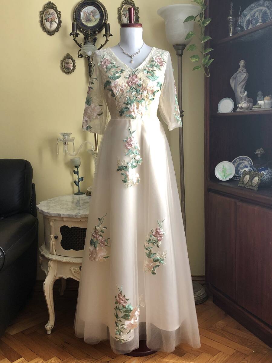 【Vicky and Lucas】より、素敵なイブニングドレスです。 シャンパン色のドレスに刺繍がとても綺麗です。 ふんわりとした二重のチュールスカートも素敵ですね。 張のあるサテンの裏地が付いています。 ブラパットが付いてブラなしでご着用頂けます。 スカートは張りがあってボリュームが出ます。 サテンの裏地が付いています。 後ファスナーで開きます。 【状態】新品 【ブランド】Vicky and Lucas 【サイズ】表示サイズ/ US(アメリカ)L 日本対応サイズ目安/ 15号サイズぐらい *個人差がございます。必ず採寸をご参照ください。 【採寸】平置き採寸です。 肩幅40cm、身幅50cm、ウエスト42cm、着丈144cm(上身丈39cm+スカート丈105cm) 【カラー】シャンパン色 【素材】ポリエステル100% 【裏地の素材】ポリエステル100% 【着脱】後ファスナー