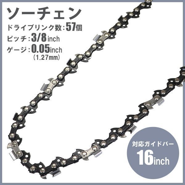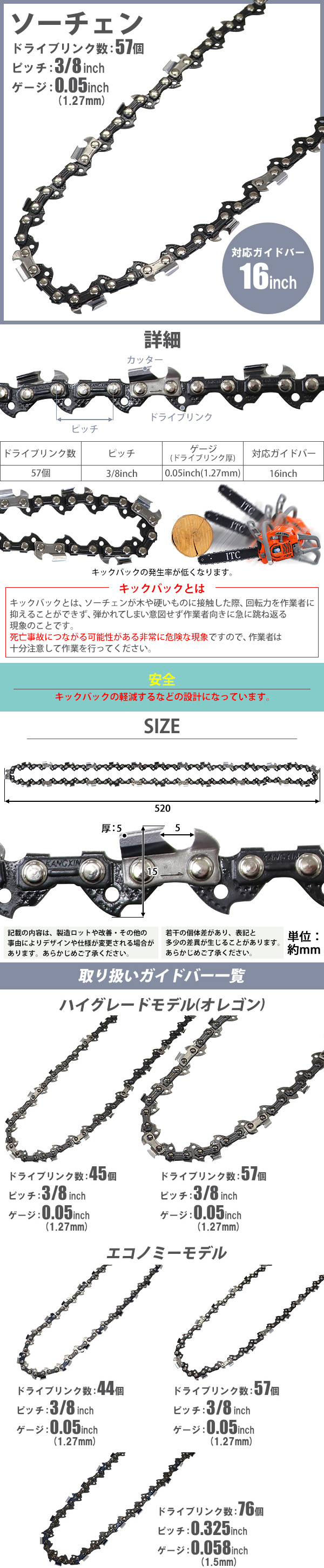 | 商品名 | 送料無料 ソーチェン ソーチェーン エコノミーモデル ドライブリンク数57 ピッチ3/8inch ゲージ0.05inch 対応ガイドバー 16インチ 40cm チェーンソー チェンソー オプション 交換 sawchain16c |