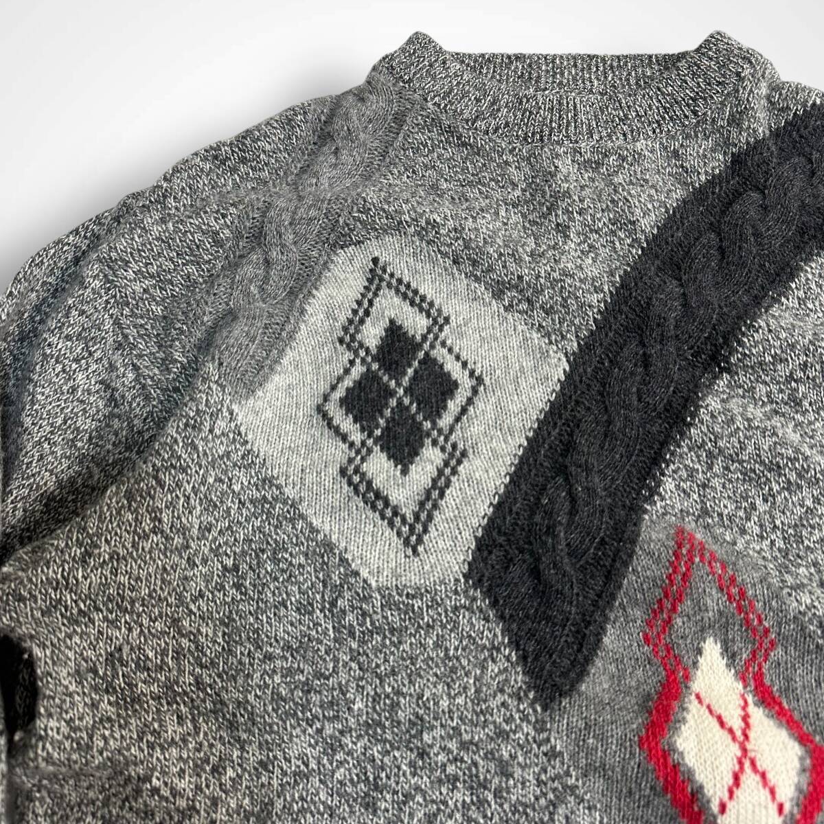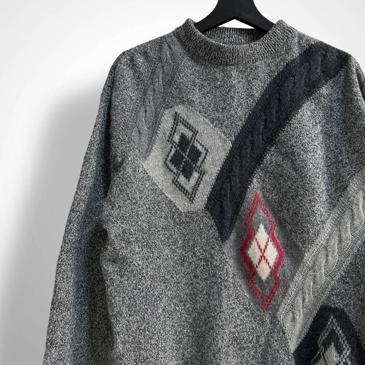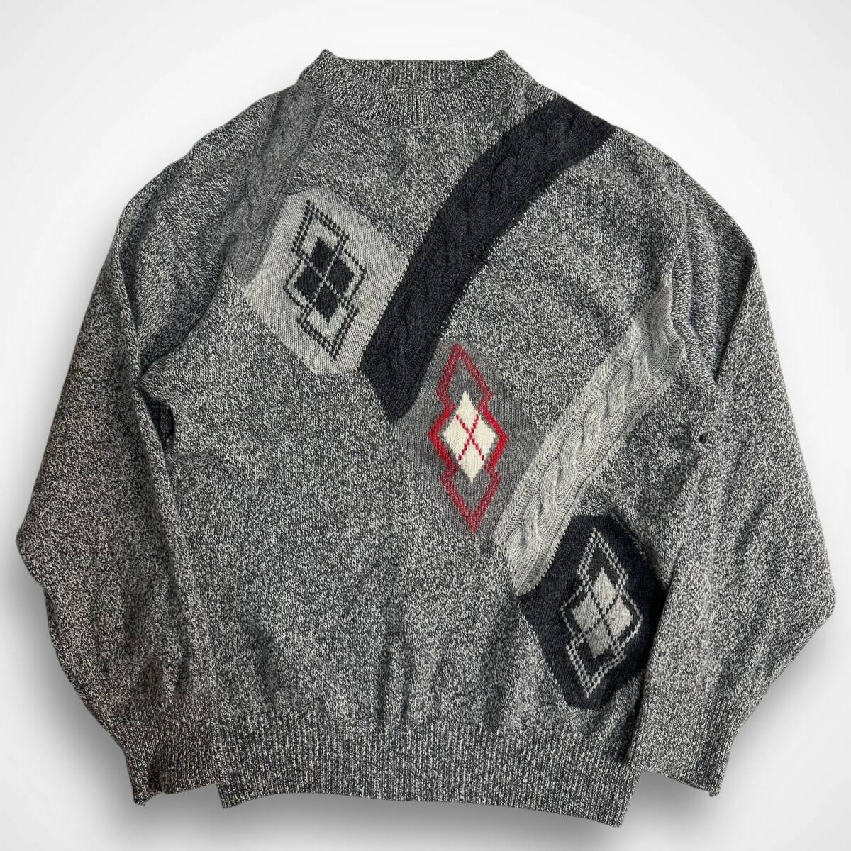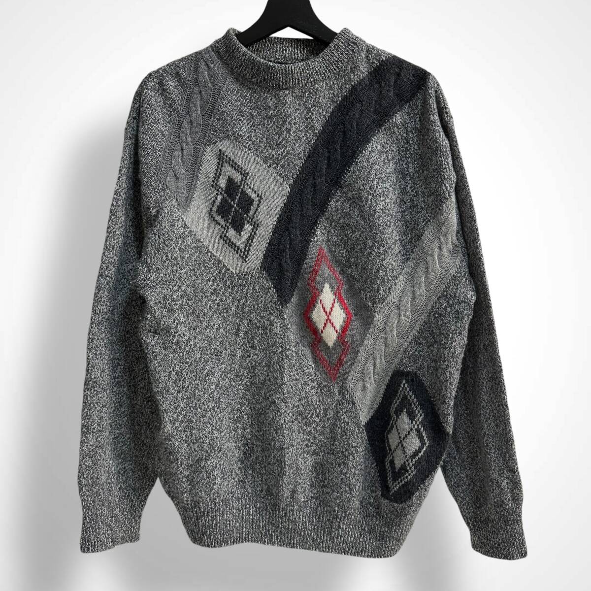 希少【Euro vintage】イタリア製 アーガイル 変形ケーブルデザイン モックネックニット レトロ ビンテージ古着 グレー ユーロ古着