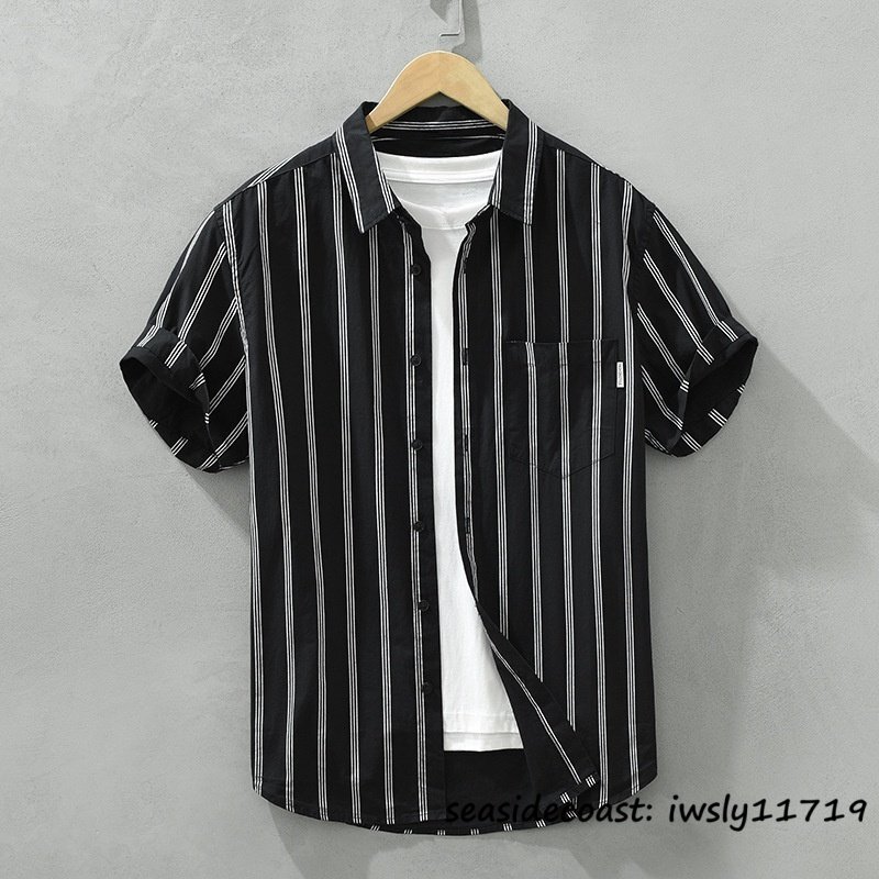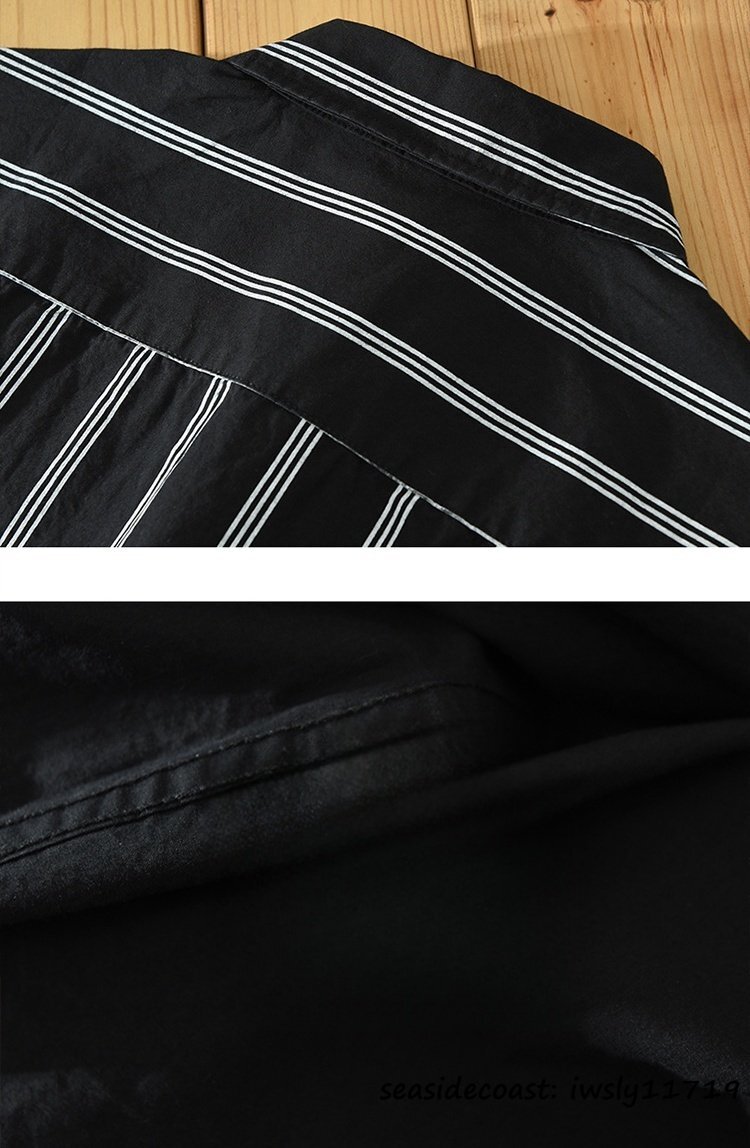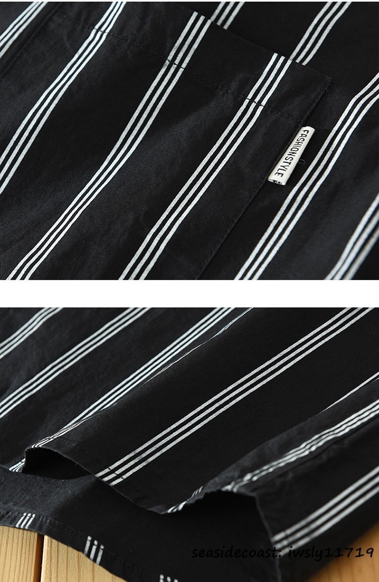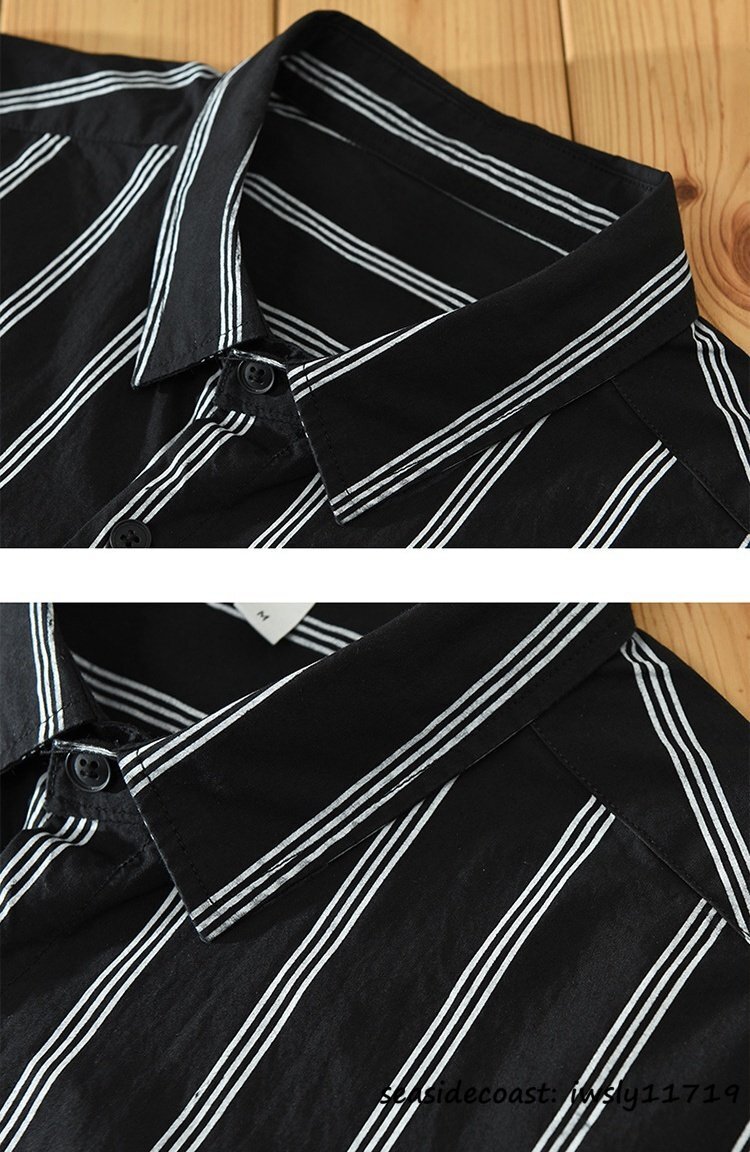 夏新品 半袖シャツ メンズシャツ ストライプ柄 サマーシャツ ビジネス カジュアルシャツ 夏服 清涼感 通勤 心地良し 紳士服 ブラック XL
