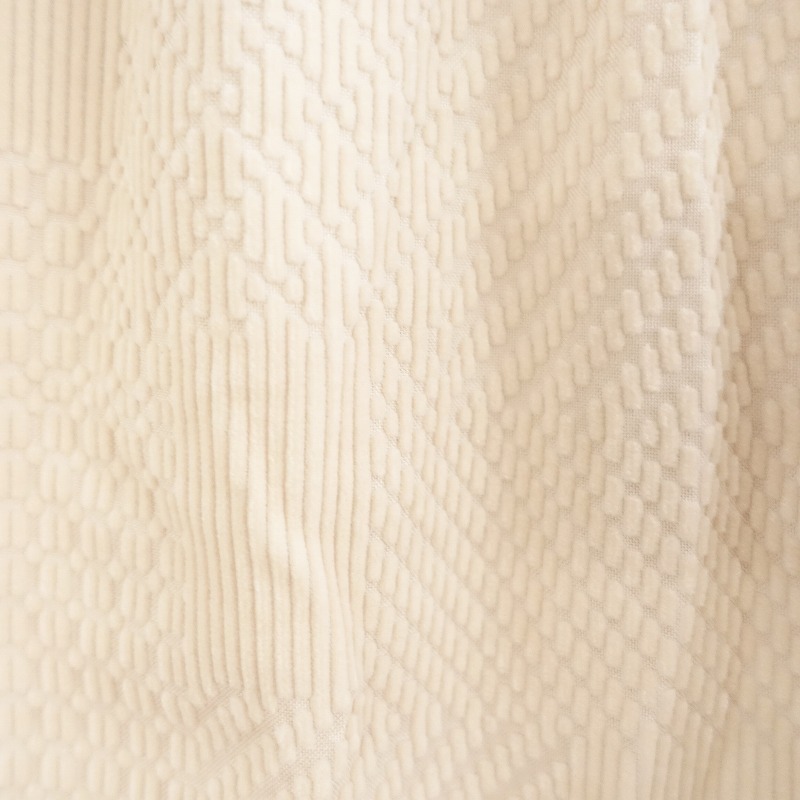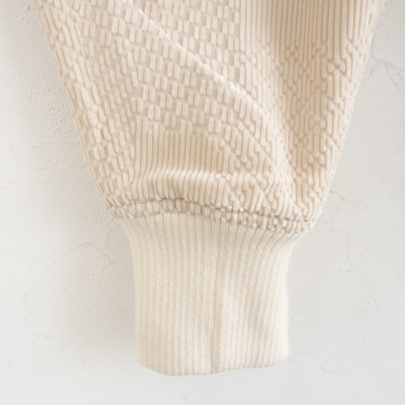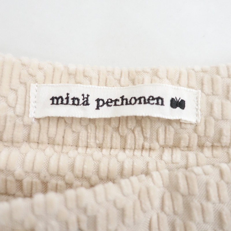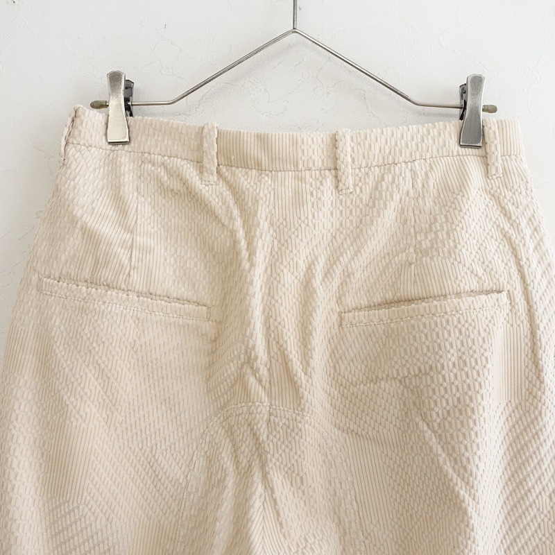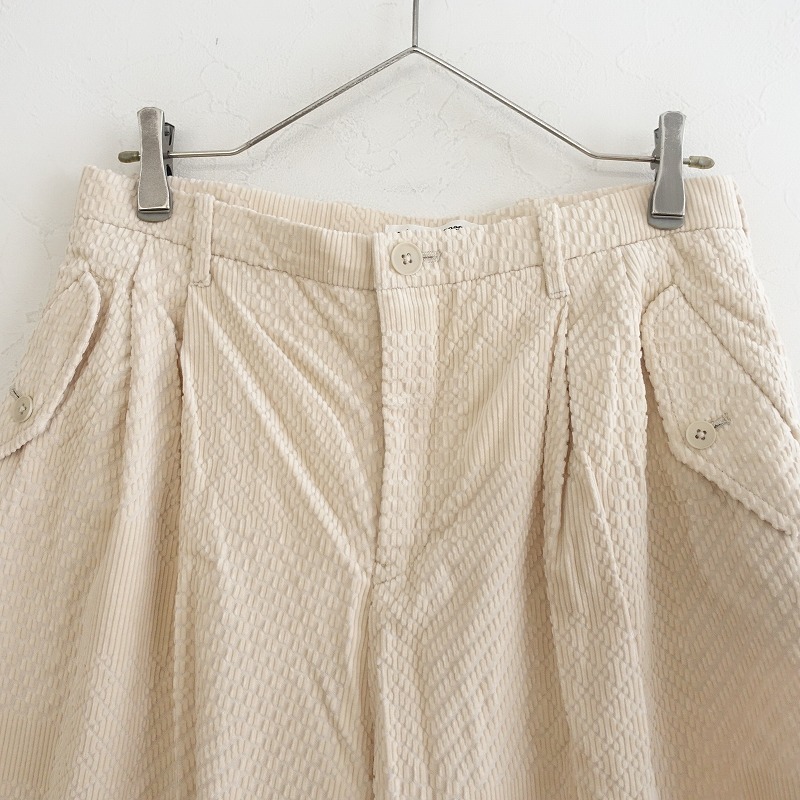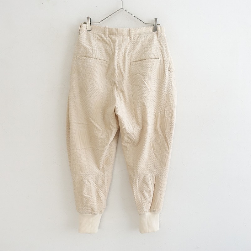 mina perhonenのland puzzle 裾リブコーデュロイパンツです。カラーはライトベージュで、柄コーデュロイ地で仕立てられており、裏地が付いております。裾はエクリュ系のリブに切り替えられ、ツータック入り、フロント開口部はジップフライ仕様です。ポケットは4つ付いております。 |