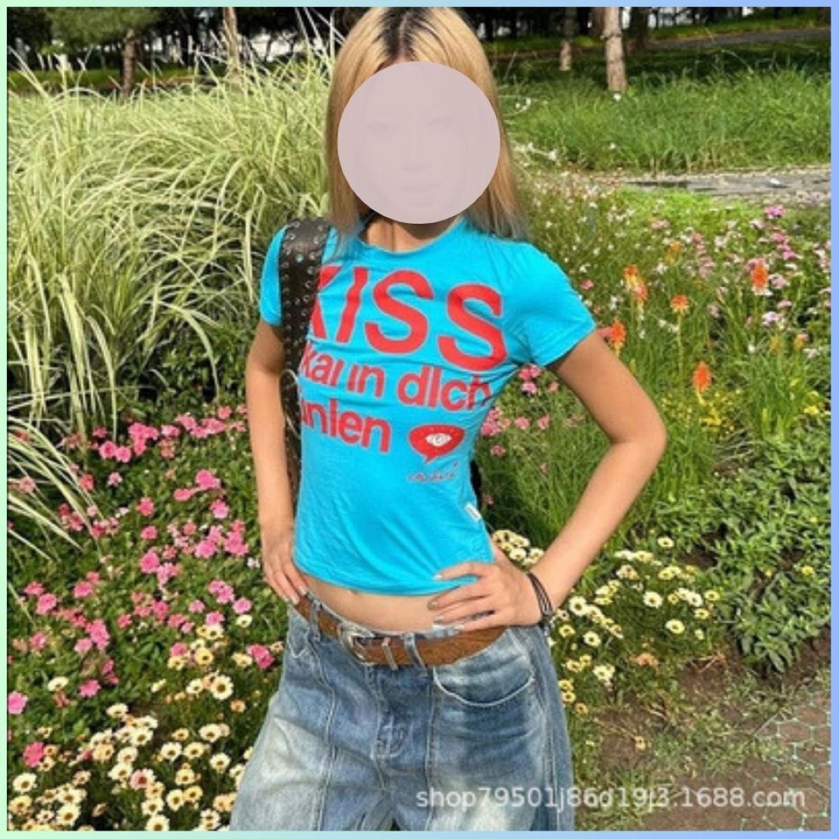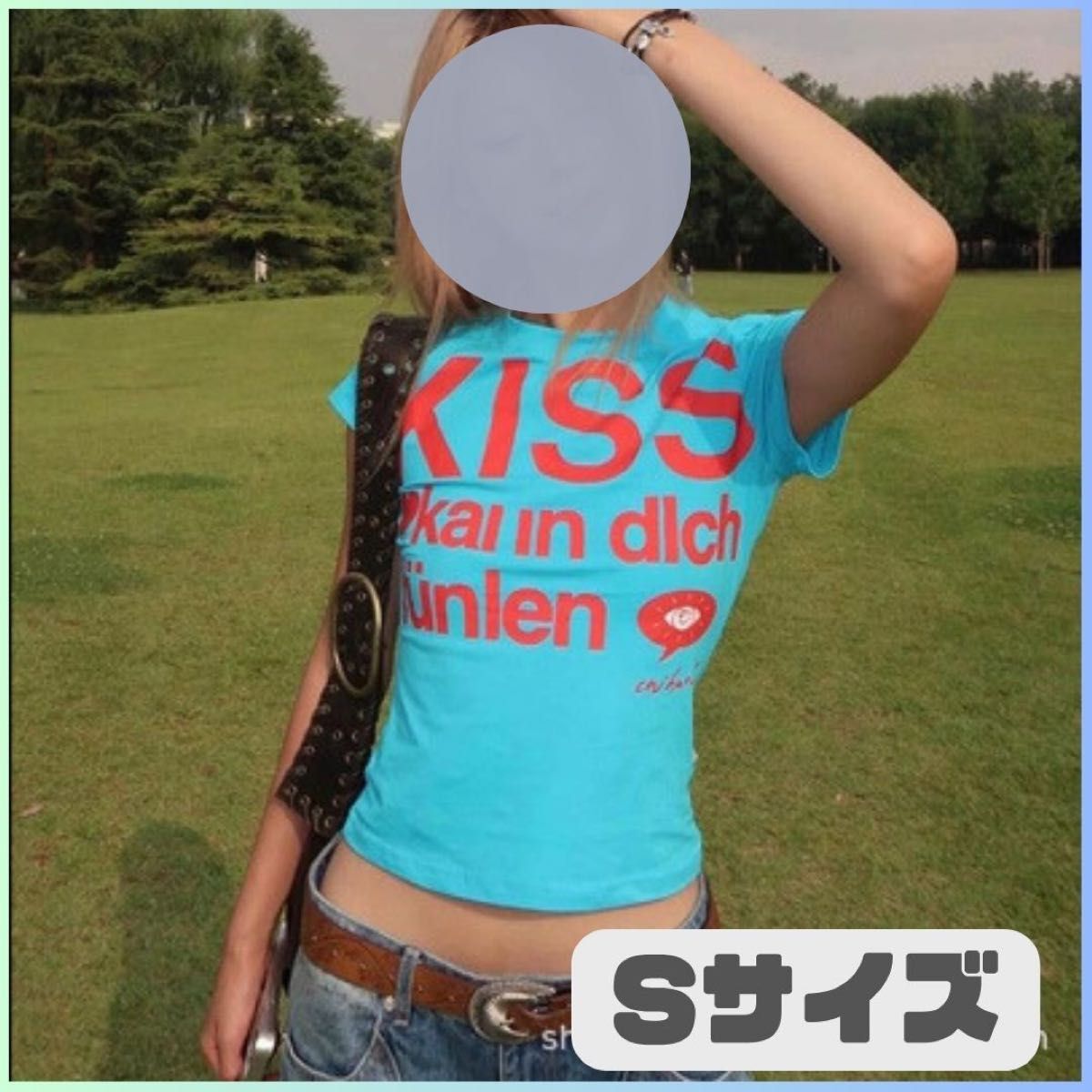 鮮やかなブルーに赤い文字が映える、海外ガール風のスタイリングが楽しめる1枚。
