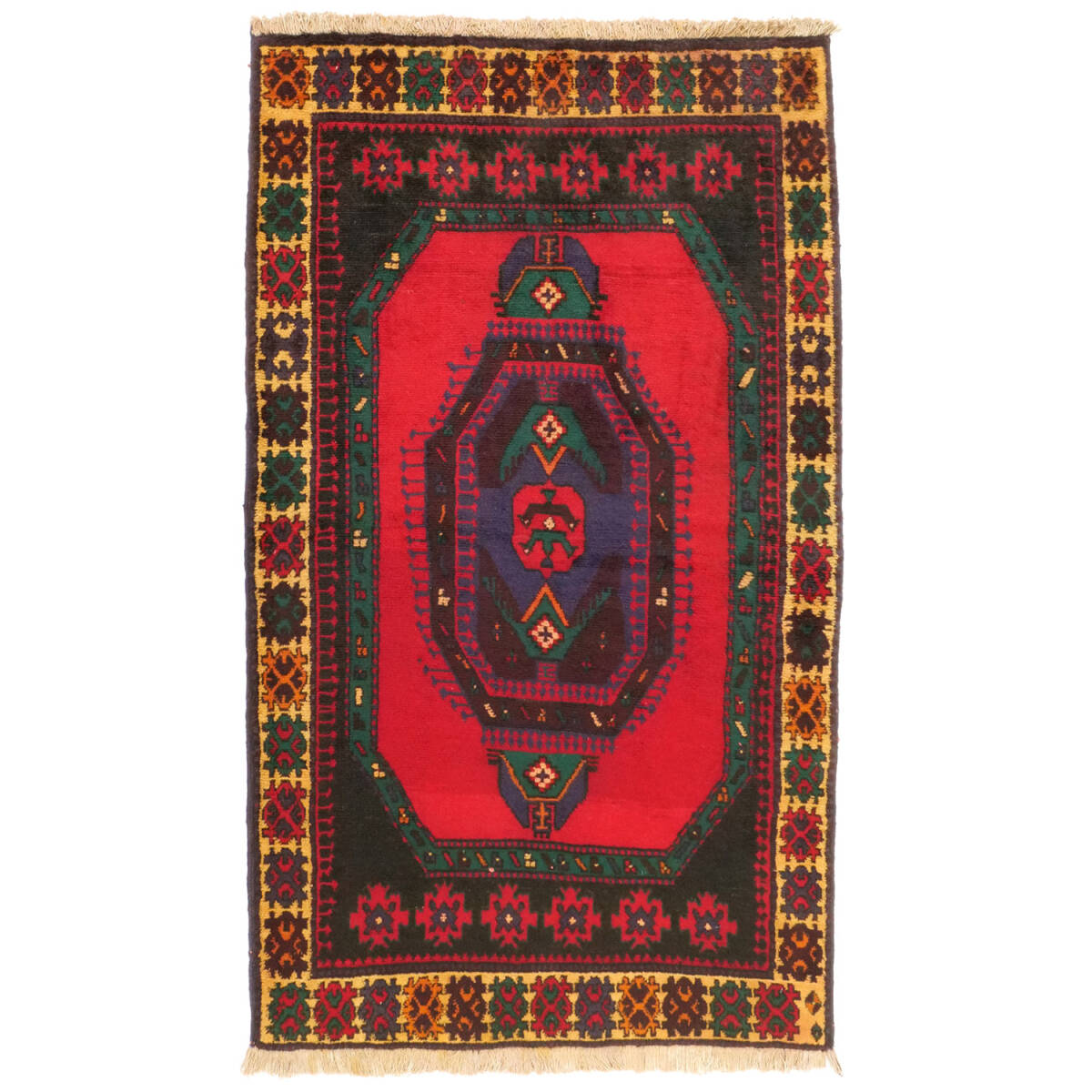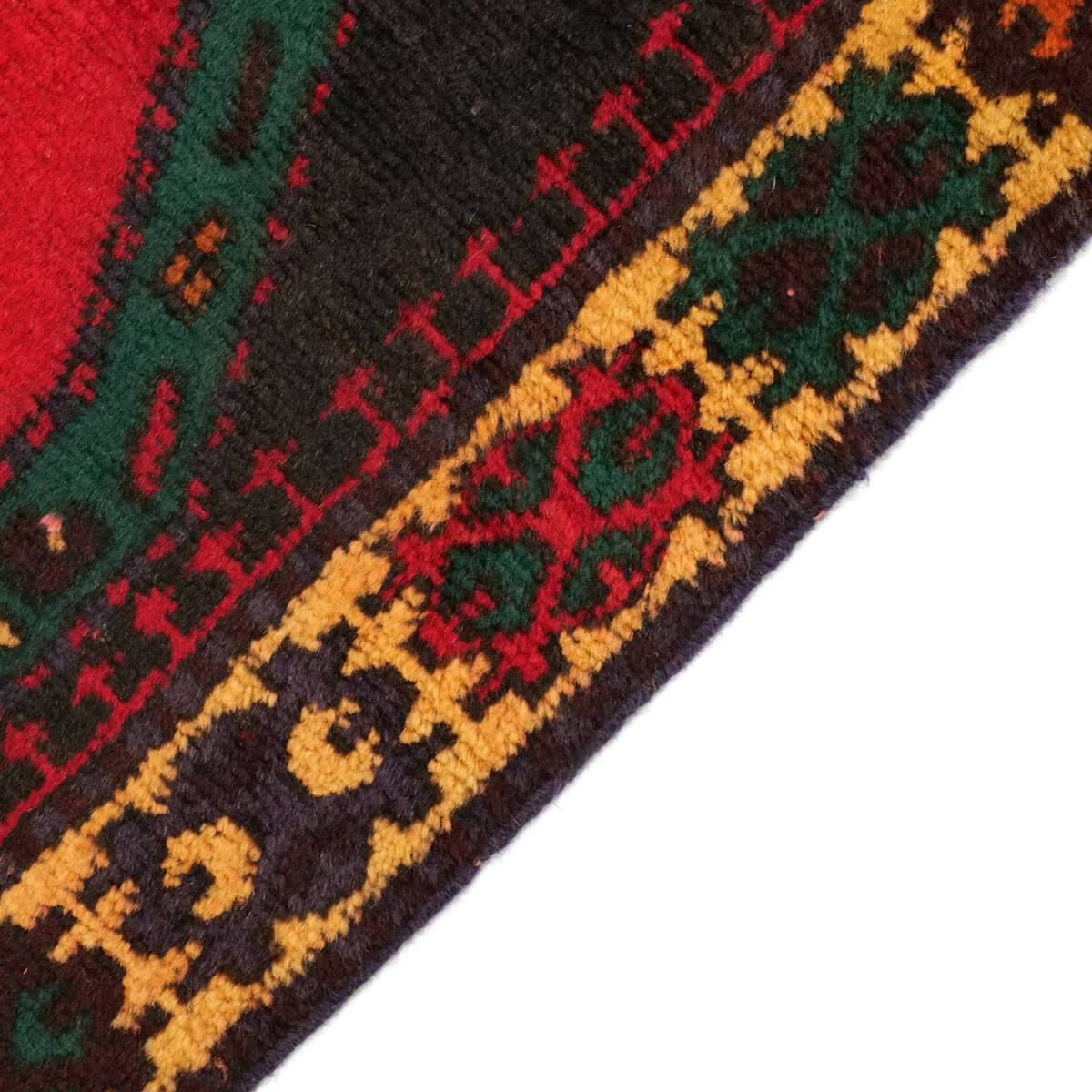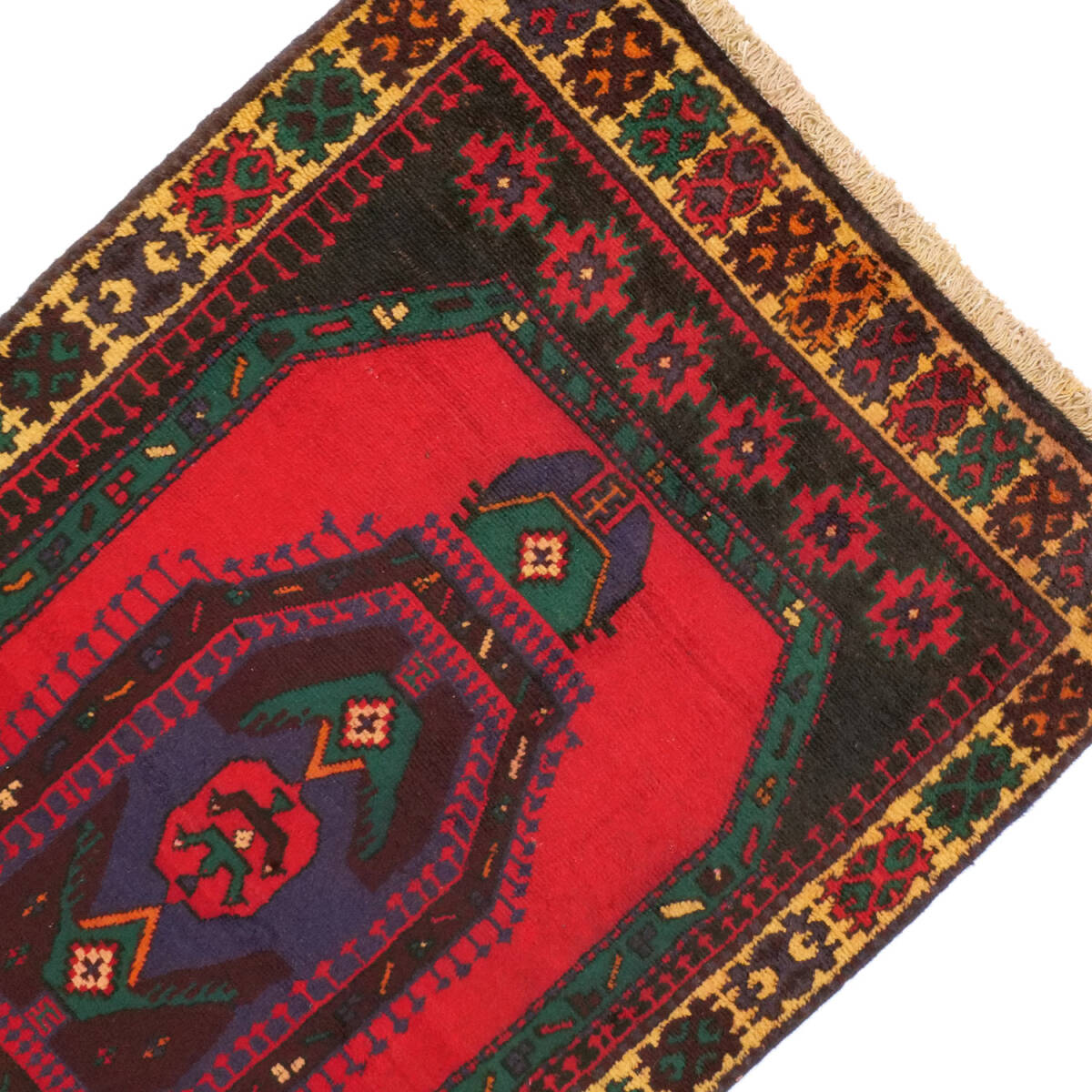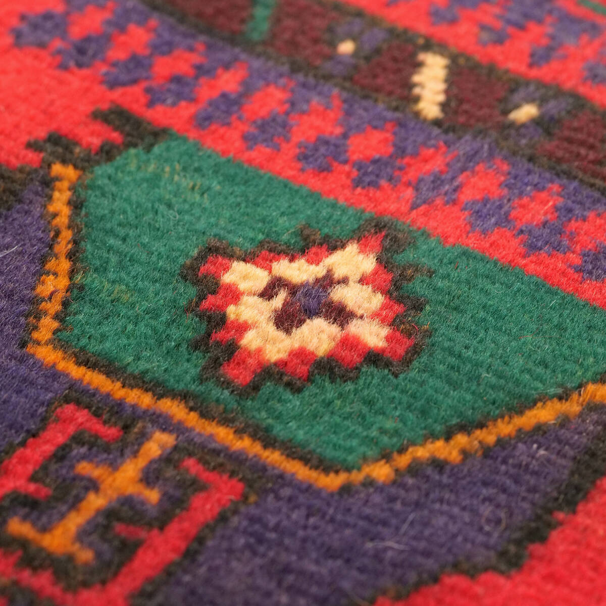 1950年代に制作されたグーチャン産のセミアンティークラグです。中央には大きなメダリオンが配され、赤地を背景に黒と緑のフレームが力強く構成されています。黄色や紫の挿し色が加わり、遊牧民織物らしい躍動感と鮮烈な印象を放つ一枚です。
