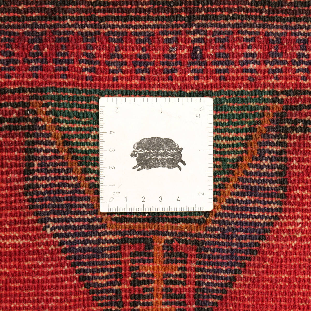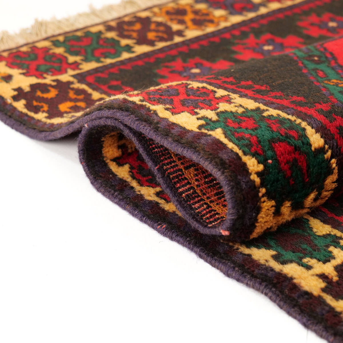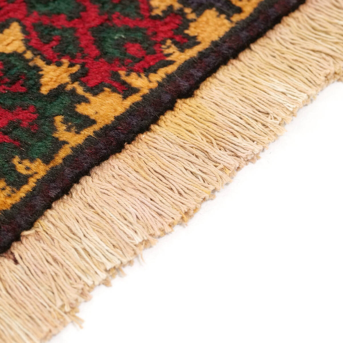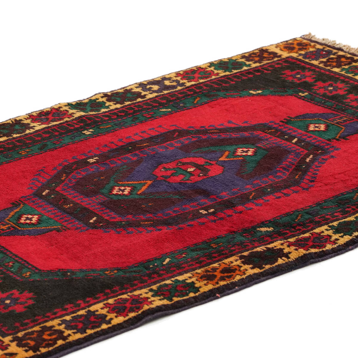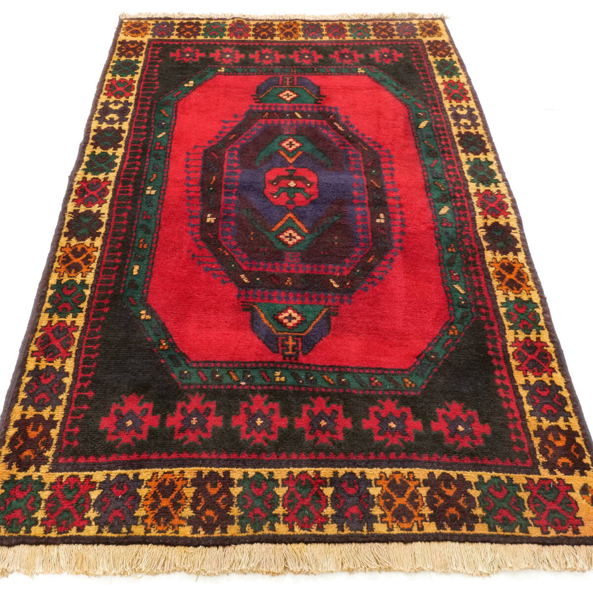 1950年代に制作されたグーチャン産のセミアンティークラグです。中央には大きなメダリオンが配され、赤地を背景に黒と緑のフレームが力強く構成されています。黄色や紫の挿し色が加わり、遊牧民織物らしい躍動感と鮮烈な印象を放つ一枚です。