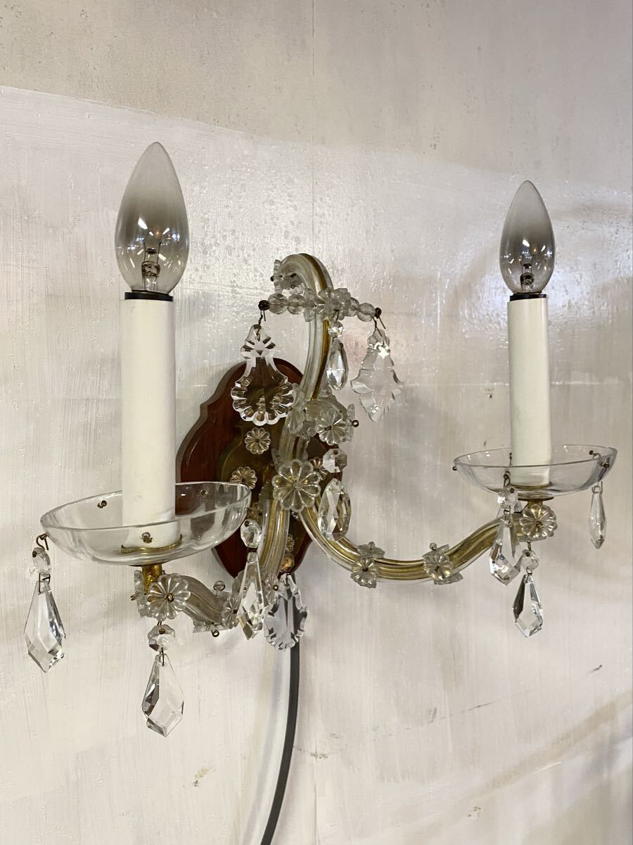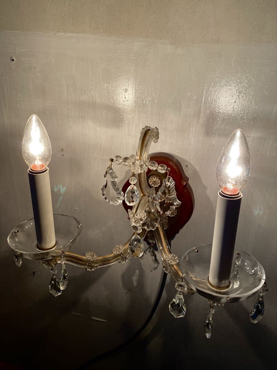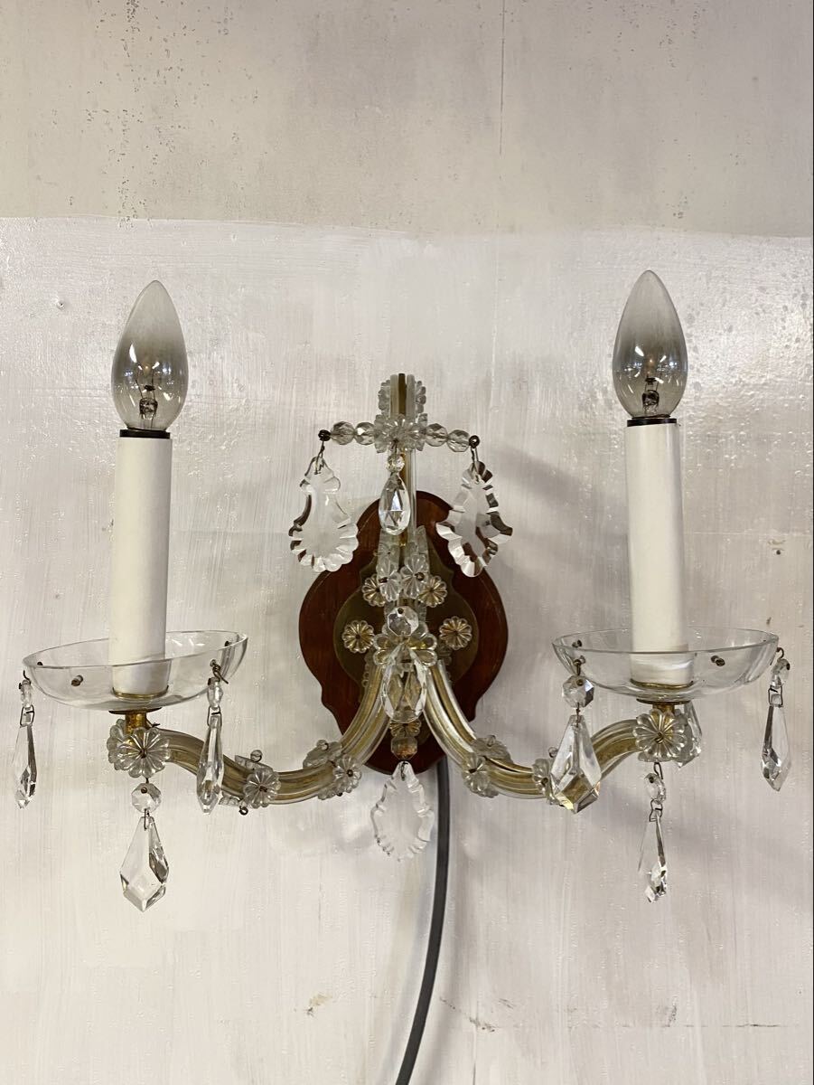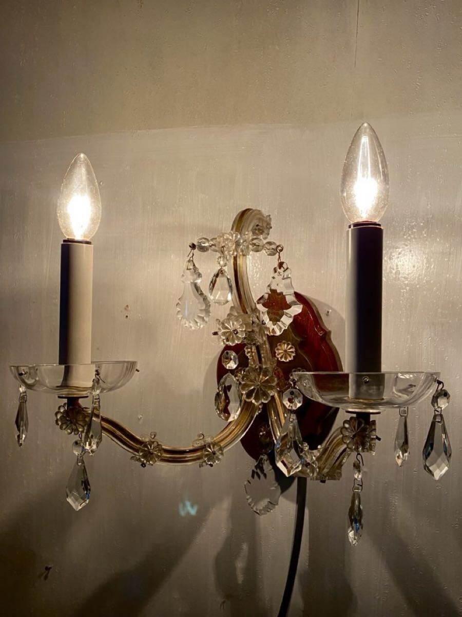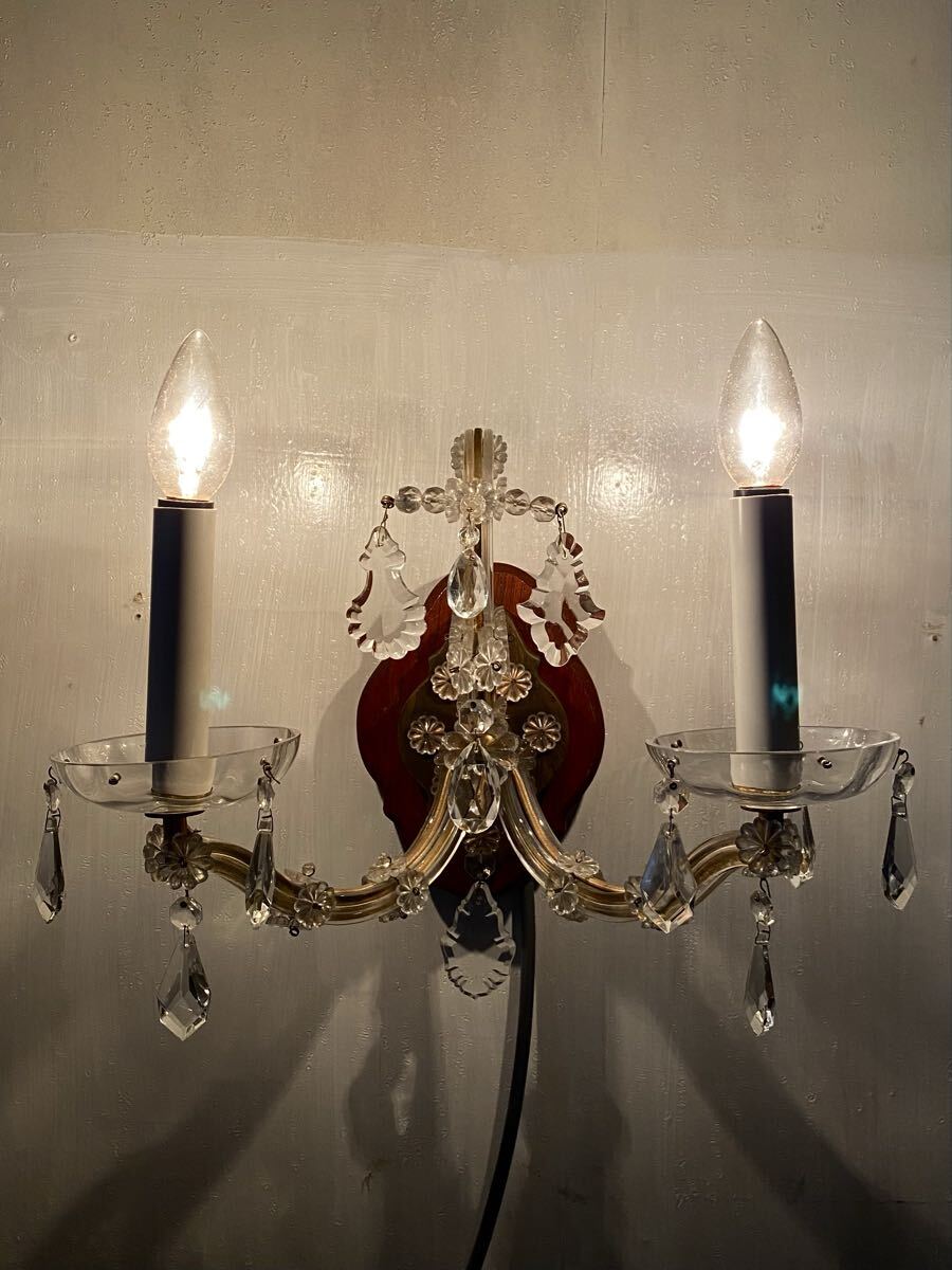 アンティーク/ビンテージのシャンデリアウォールランプです。 2灯の小型ですが、オーストリア製マリア・テレジア型の本格的なシャンデリアです。 美しくカットされたクリスタルガラスが光輝き、ガラスは受け皿にも、金属アームを挟んで使われています。 パーツを引っ掛けるリングが40近くあり、様々な仕様でお楽しみいただけます。 日本では馴染みが無い壁掛けシャンデリアで特別なお部屋に。 なんともオーラのある素晴らしい一品です。 E-14型の球が付きます。(電球は付属はしません) 木の土台無しでもお使いいただけます。(最後2枚の写真) 配線は90cm程で切りっぱなしです。取り付け環境に応じて加工してご使用ください。(写真ではコンセント線を繋いでいます) 【サイズ】 H235mm(吊り下げパーツ含めず) W355mm D235mm 土台145mm×95mm 木の土台190mm×140mm 【状態】 特に目立つダメージ、ワレや大きなカケ等見当たりませんが、細かなもの程度はご了承ください。 パーツは写真のものが全てです。不揃いな部分もございます。 商品No:k00264 |