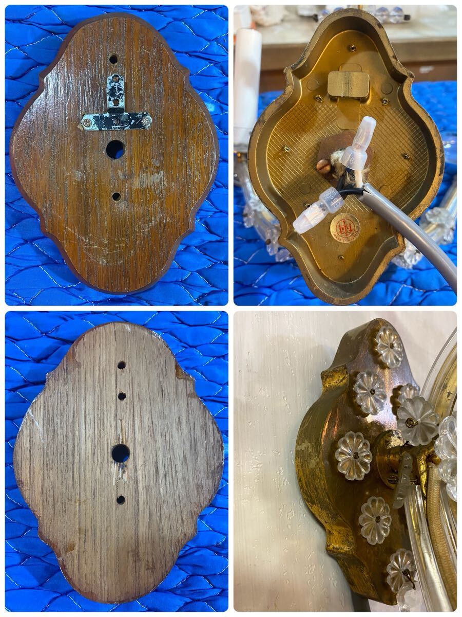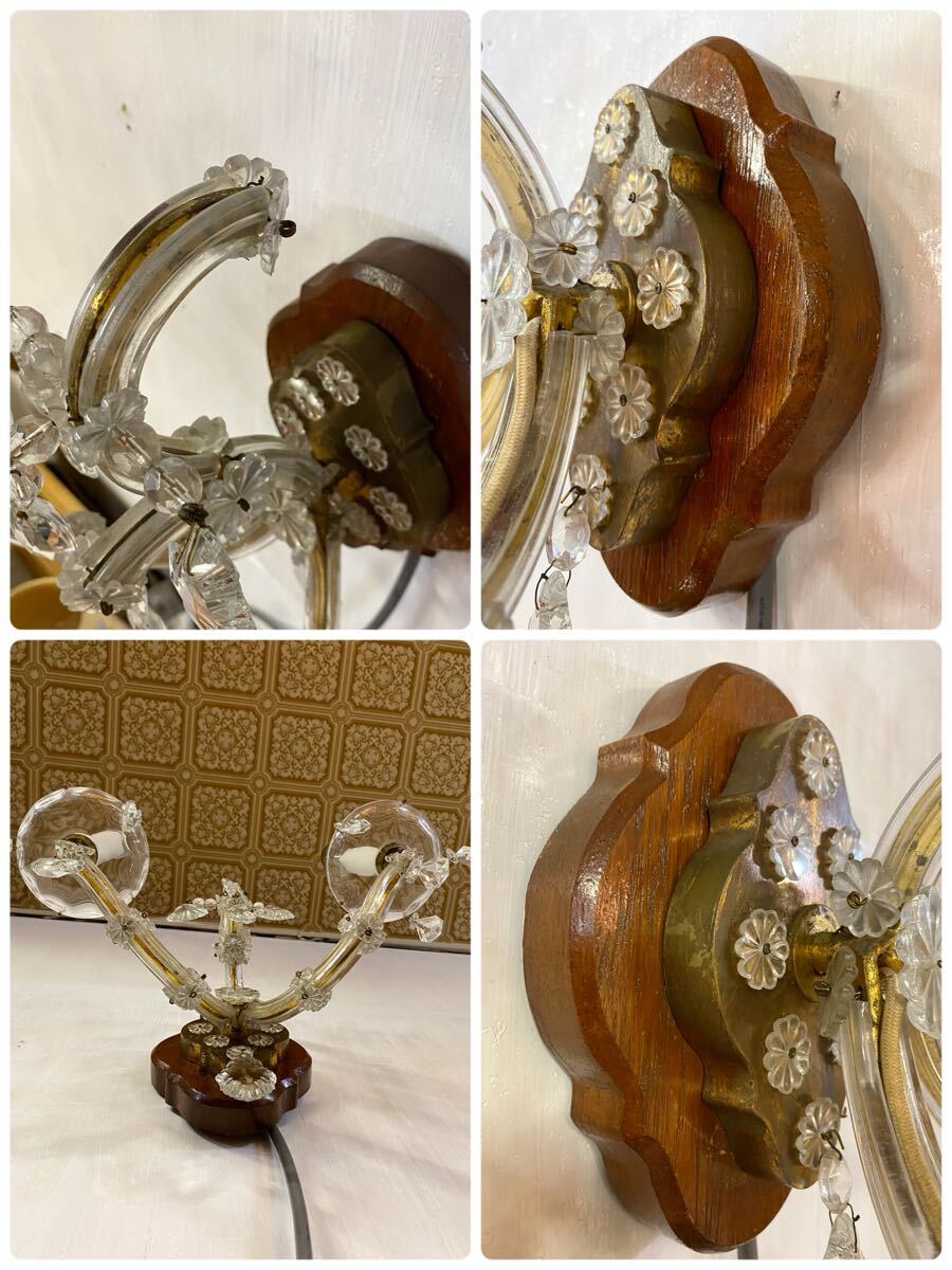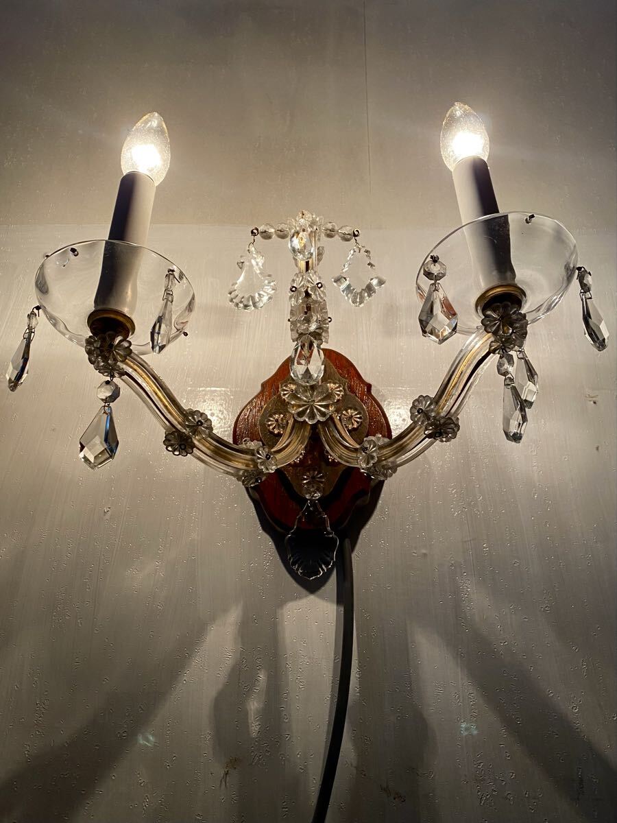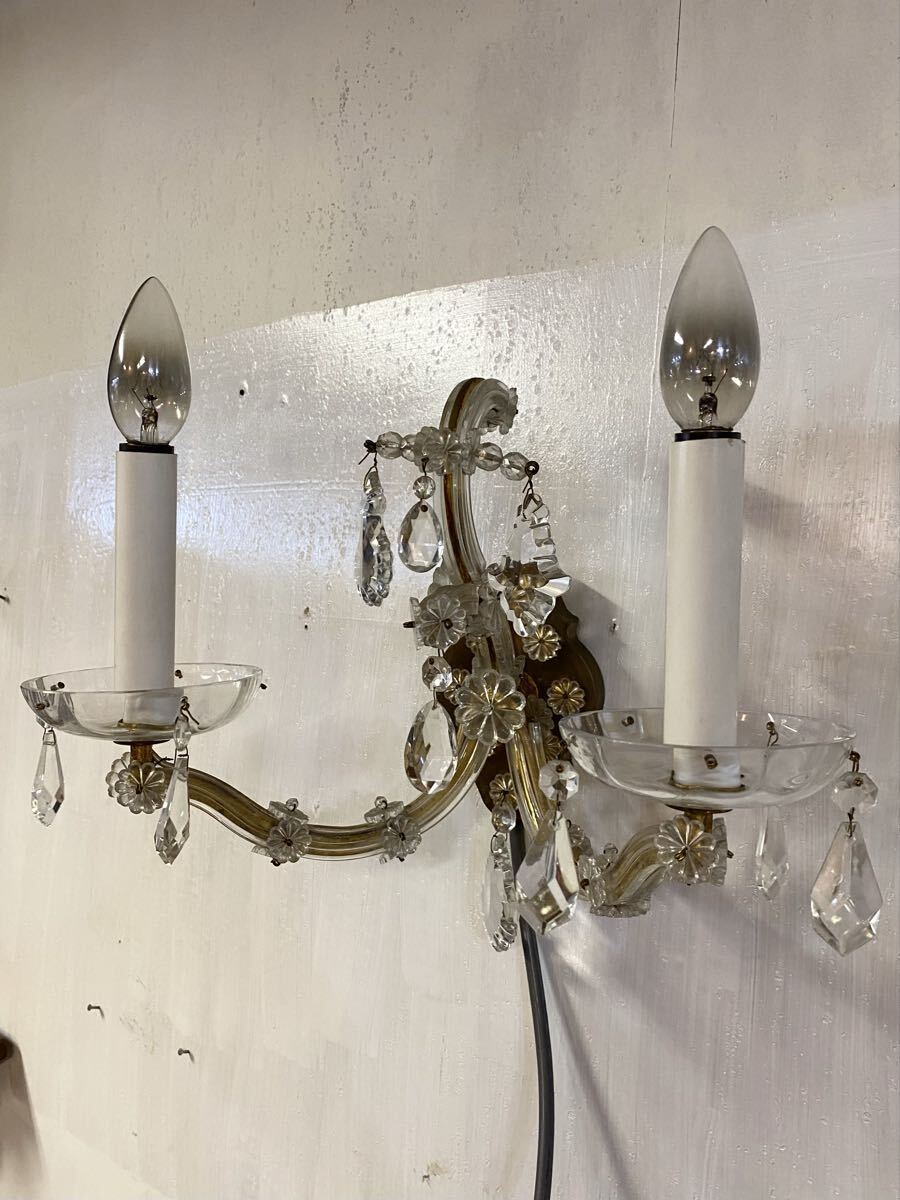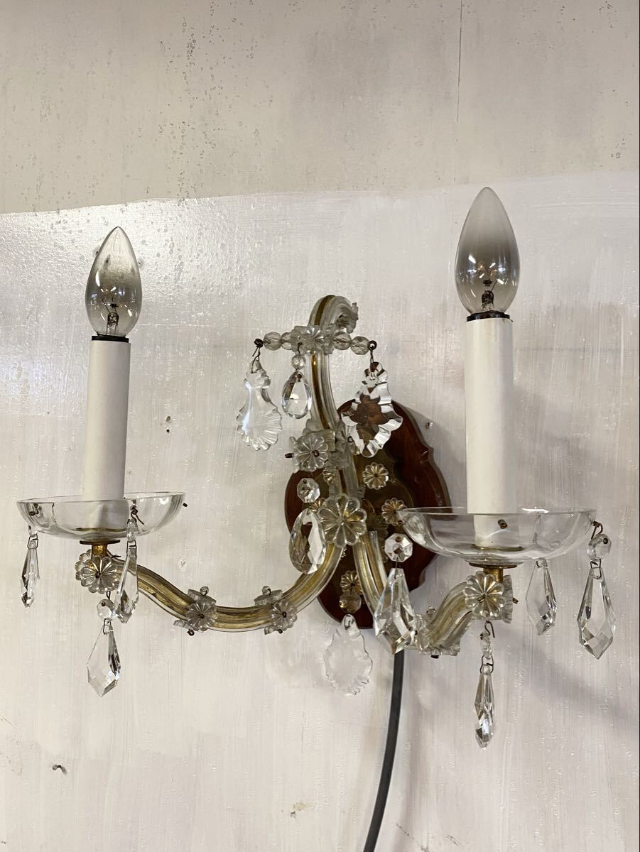 アンティーク/ビンテージのシャンデリアウォールランプです。 2灯の小型ですが、オーストリア製マリア・テレジア型の本格的なシャンデリアです。 美しくカットされたクリスタルガラスが光輝き、ガラスは受け皿にも、金属アームを挟んで使われています。 パーツを引っ掛けるリングが40近くあり、様々な仕様でお楽しみいただけます。 日本では馴染みが無い壁掛けシャンデリアで特別なお部屋に。 なんともオーラのある素晴らしい一品です。 E-14型の球が付きます。(電球は付属はしません) 木の土台無しでもお使いいただけます。(最後2枚の写真) 配線は90cm程で切りっぱなしです。取り付け環境に応じて加工してご使用ください。(写真ではコンセント線を繋いでいます) 【サイズ】 H235mm(吊り下げパーツ含めず) W355mm D235mm 土台145mm×95mm 木の土台190mm×140mm 【状態】 特に目立つダメージ、ワレや大きなカケ等見当たりませんが、細かなもの程度はご了承ください。 パーツは写真のものが全てです。不揃いな部分もございます。 商品No:k00264 |