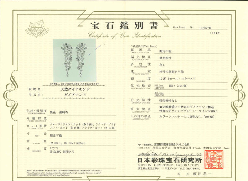 | 仕様 | D=2.88ct 2.88 ct デザイン部43.5×15.1mm デザイン部43.5×15.1mm 4.3g×2 |