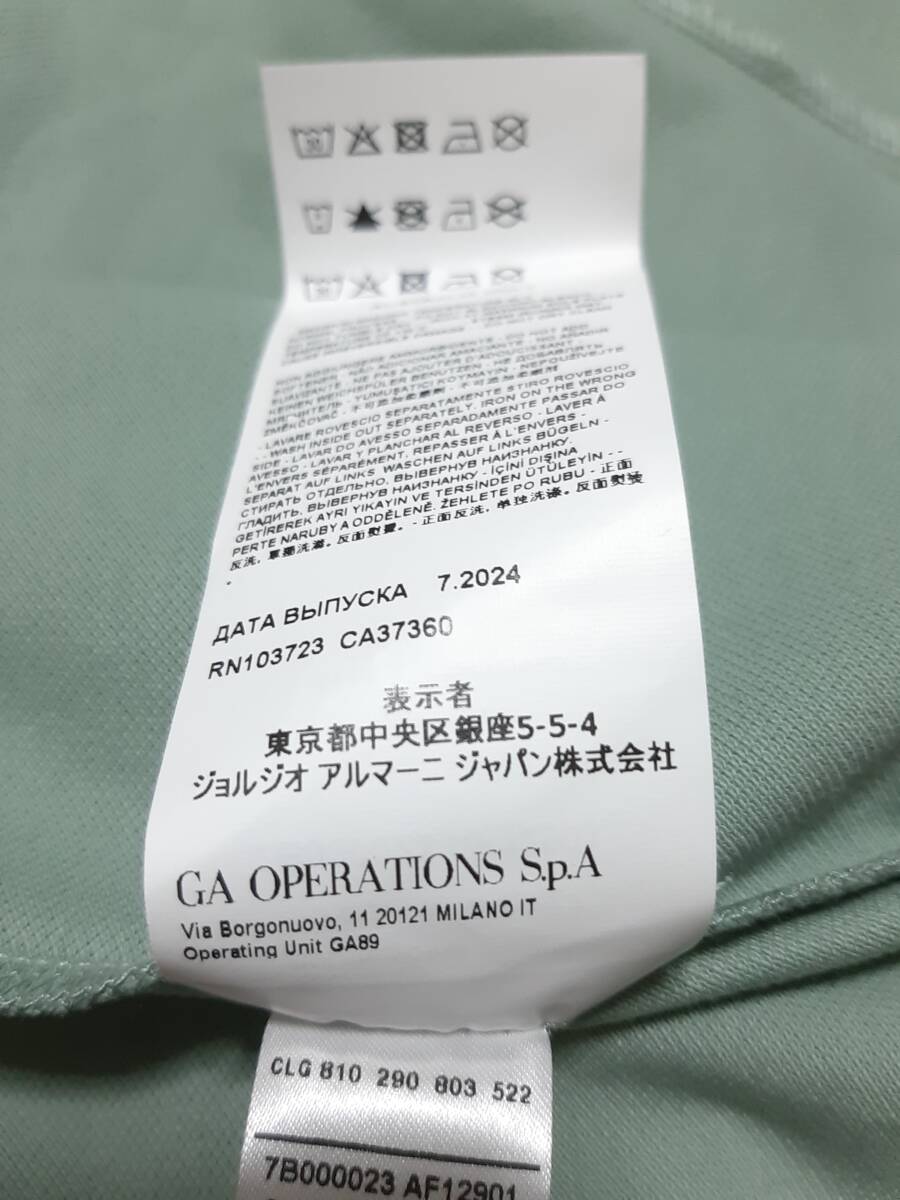 現在は並行輸入品でも、服の内部に付いた品質表示のタグには日本語で、【表示者 ジョルジオ アルマーニ ジャパン株式会社】と記されていることを理解しておいてください。また、輸入元の海外は日本ほど商品の扱いが丁寧ではありません。生地に若干のスレなどがある場合があり、目立つものは記しますが、目立たないものに関しては記しませんので、完璧な商品をお求めな方は正規店をご利用ください。