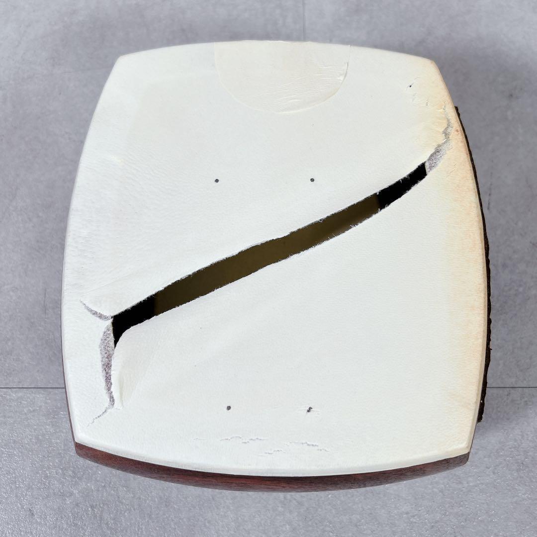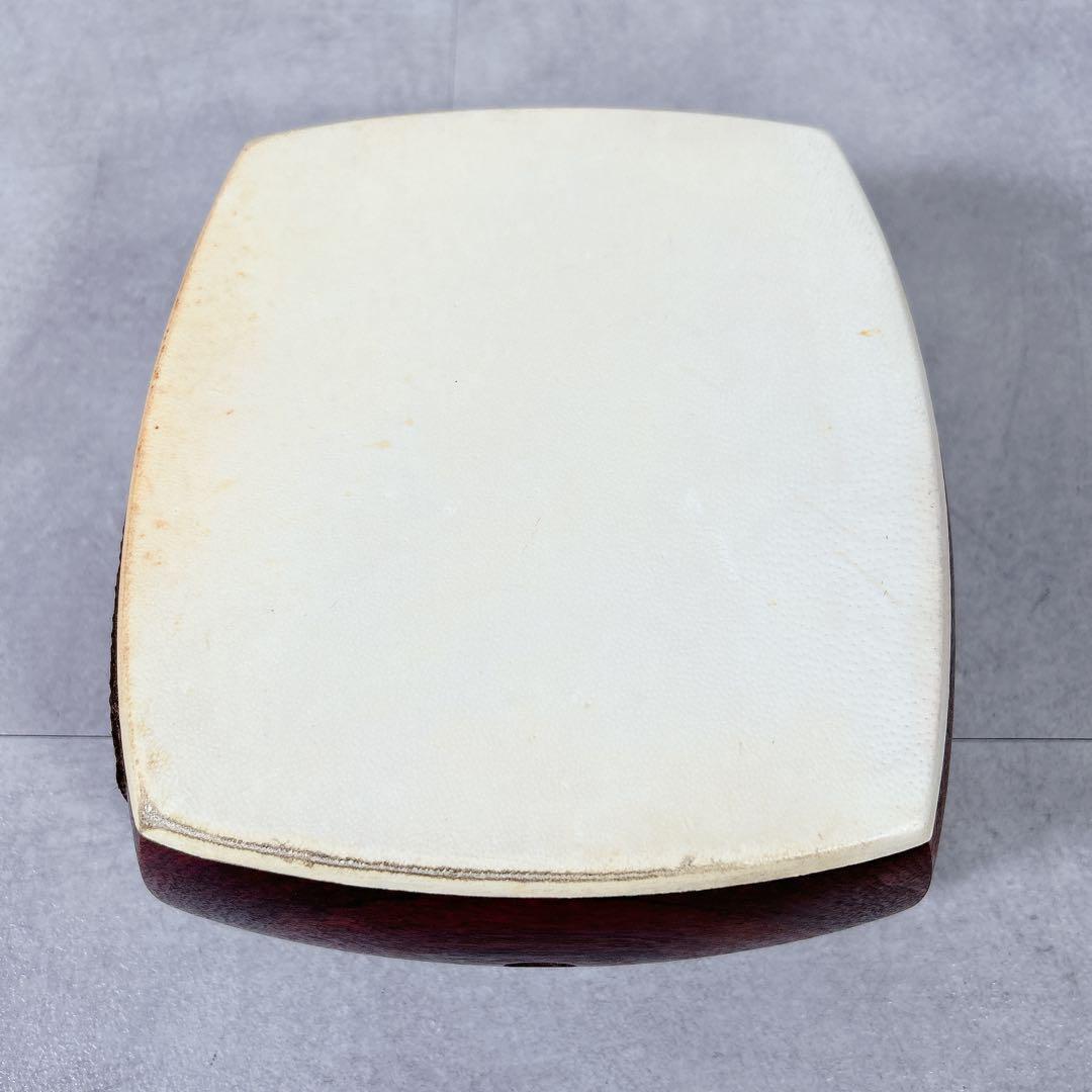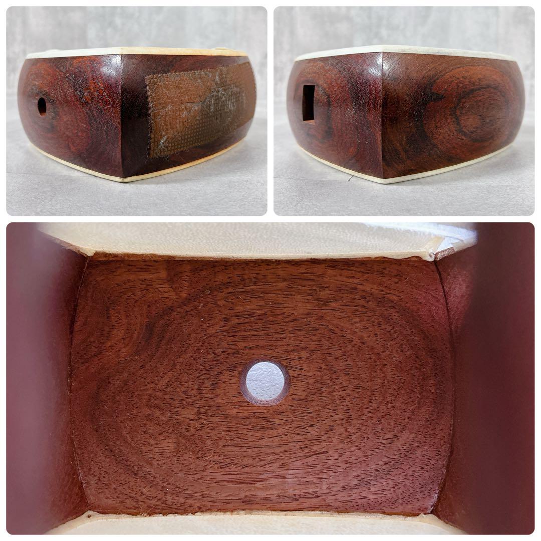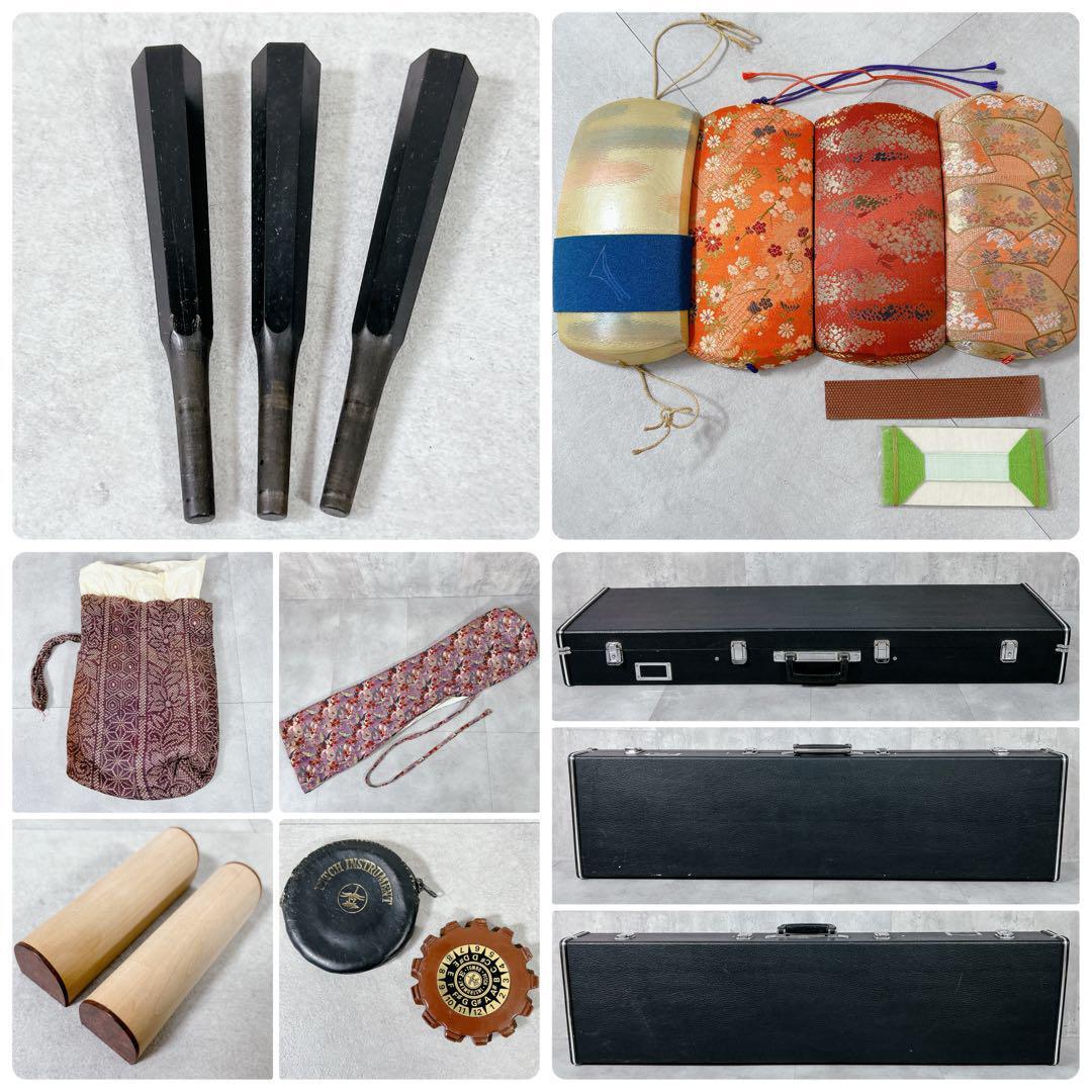 胴の皮に破れがあり、布製の袋は保管中の染み汚れがあります。