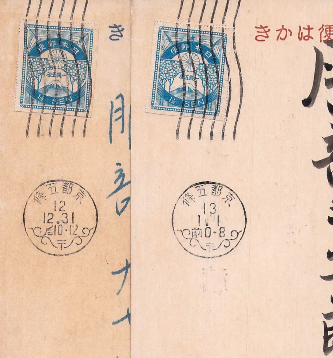 ★ 京都五條機械印の12/31最終便と1/1初便 ★ 震災1銭5厘貼り2通 ★25366★