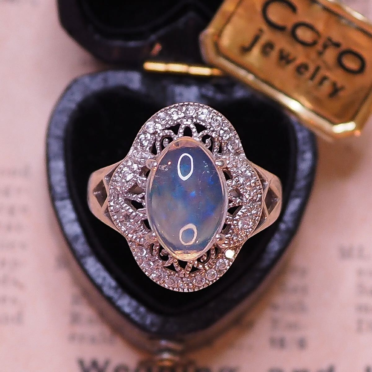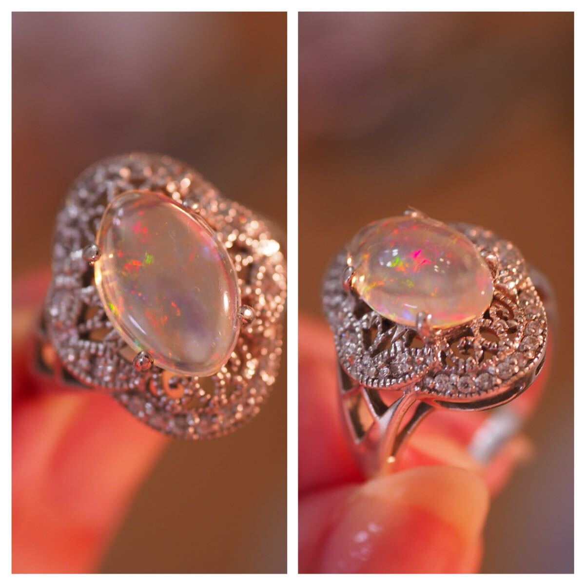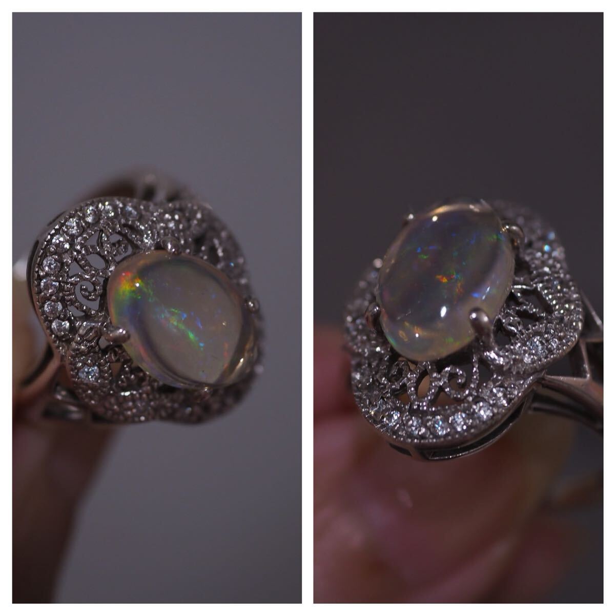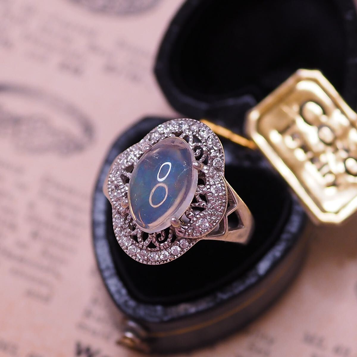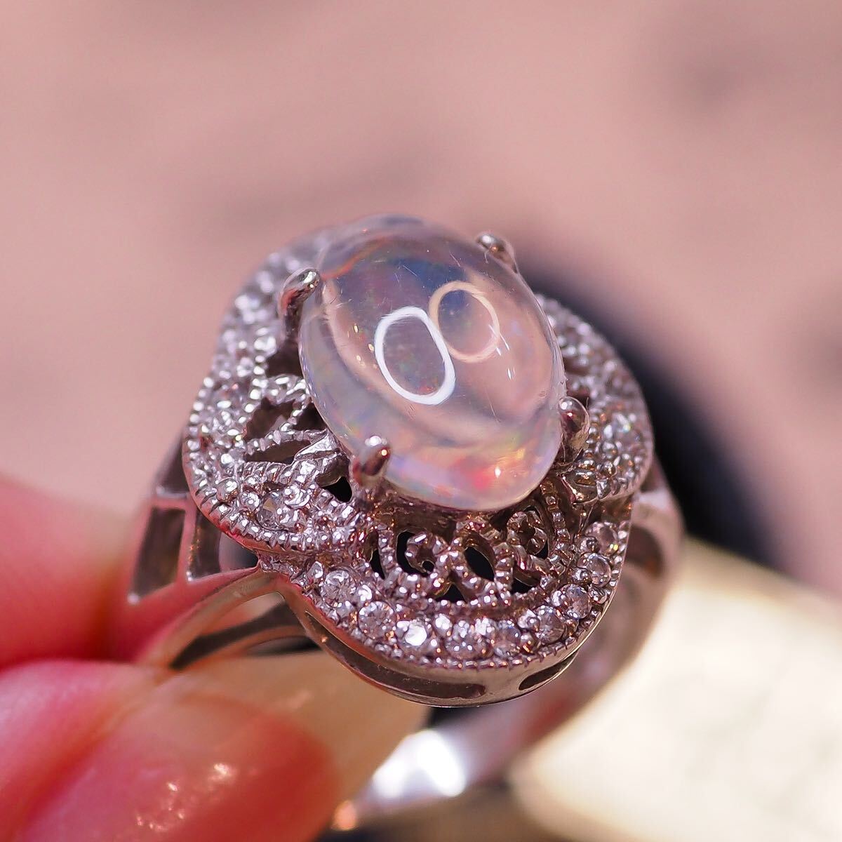 お見た目そのままのぷるぷるの水滴、透明過ぎるウォーターオパールです。大変ウォータリーで水の中に虹のカケラを閉じ込めてしまったかのよう。遊色はほんのりと僅かで写真に収めるのがやっと、LED下で目を凝らして見ると見つけられます。なかなか見つけられない大粒のウォーターオパール、派手な遊色よりもみずみずしいイメージがお好きな方におすすめのリングです。