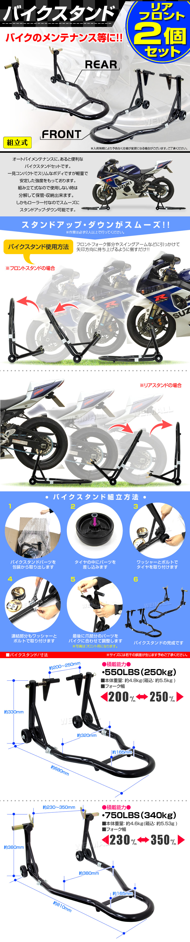 | オートバイメンテナンスに、あると便利なバイクスタンドセットです。 一見コンパクトでスリムなボディですが軽量で安定した強度をもっております。 組み立て式なので使用しない時は分解して保管・収納出来ます。 しかもローラー付なのでスムーズにスタンドアップ・ダウン可能です。 【仕様】 ★フロント用 ・積載能力: 550LBS(250kg) ・フォーク幅:200~250mm ・本体重量: 約4.8kg ★リア用 ・積載能力: 750LBS(340kg) ・フォーク幅:230~350mm ・本体重量: 約4.6kg |