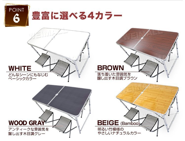 | 軽量アルミ製+取っ手付きで持ち運びしやすい! 椅子はテーブルの中に収納し折りたためるので、車のトランクに積んで移動もラクラクです。 開いてロックするだけの簡単設置タイプなので、女性でも1人で組立カンタン! テーブルは3段階の高さ調節ができ、ローテーブルとしても使えます。 天板中心部にはパラソル用ホールがあるので、ベランダやテラスでの使用にもおススメです♪ ■商品コード:A61120D ■商品仕様 カラー:ベージュ サイズ(約) テーブルサイズ:幅120×奥行60×高さ55/70cm 収納サイズ:幅60×奥行7×高さ60cm チェアサイズ:幅33×奥行29×高さ35cm パラソル用ホール直径サイズ:26mm 重量:(約)4.3kg ※テーブルのみ 耐荷重:(約)テーブル25kg / イス70kg 材質:(天板)MDFボート(耐熱・防水加工) (外枠)アルミニウム、スチール、ポリプロピレン 他 ■注意事項 ・初めてご使用の場合、耐久性を高めるために天板がフラットにならず山なりになっております。 適度な力で上から押していただくと改善されますので、お試しください。初期不良ではございません。 ・海外製品で、簡易梱包での輸入のため風防に擦れや多少の小キズなどがある場合がございますが、 商品自体には問題ありませんのでご了承下さい。 ・商品は、モニターによって色合いが異なって見える場合があります。 ・仕様・デザインは改良のため予告なく変更することがあります。 ■保障期間 7日間 ※商品到着後7日以内の初期不良・破損のみご対応させていただきます。 【新品未使用品です】 |