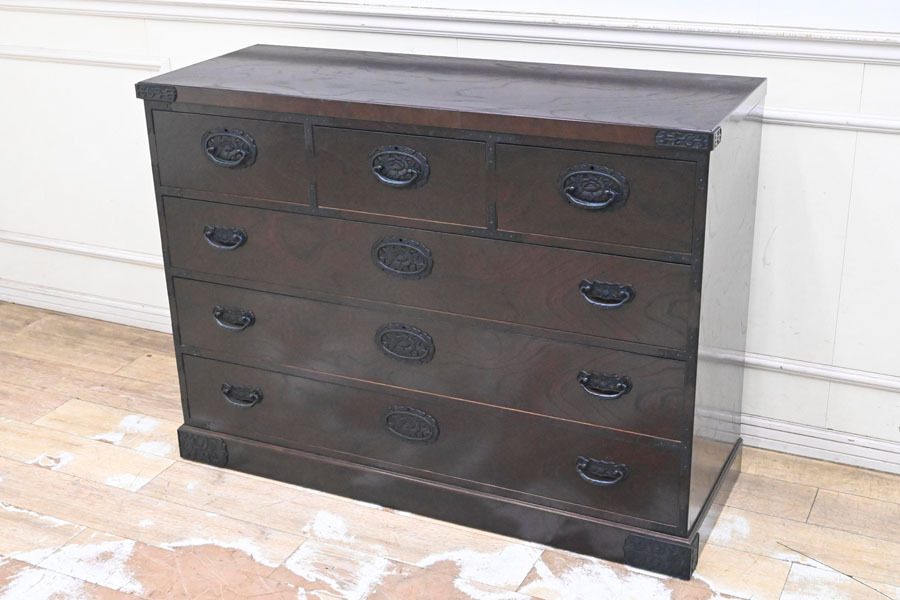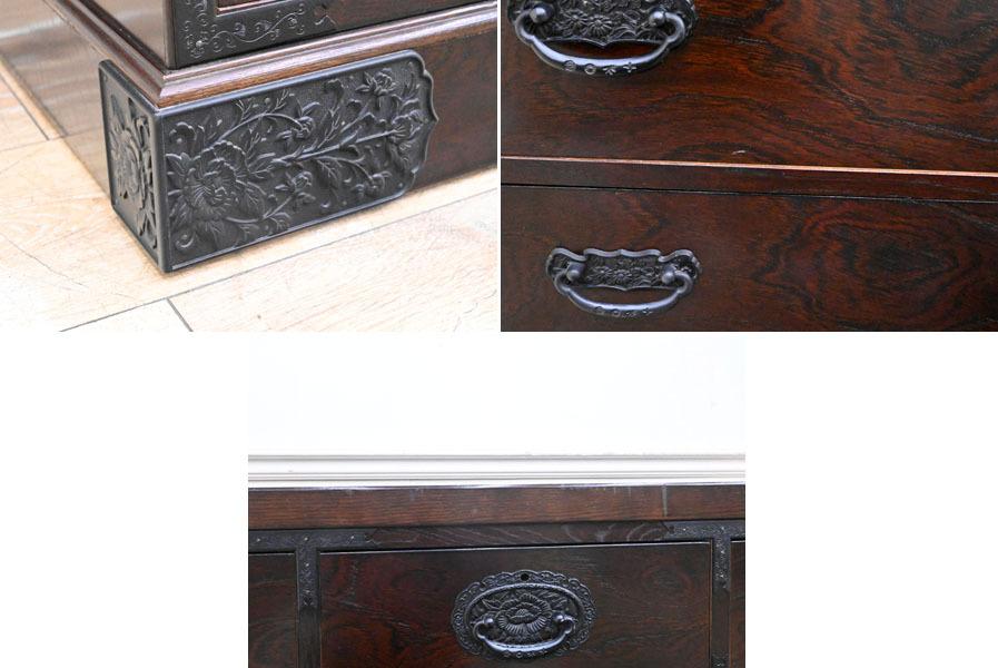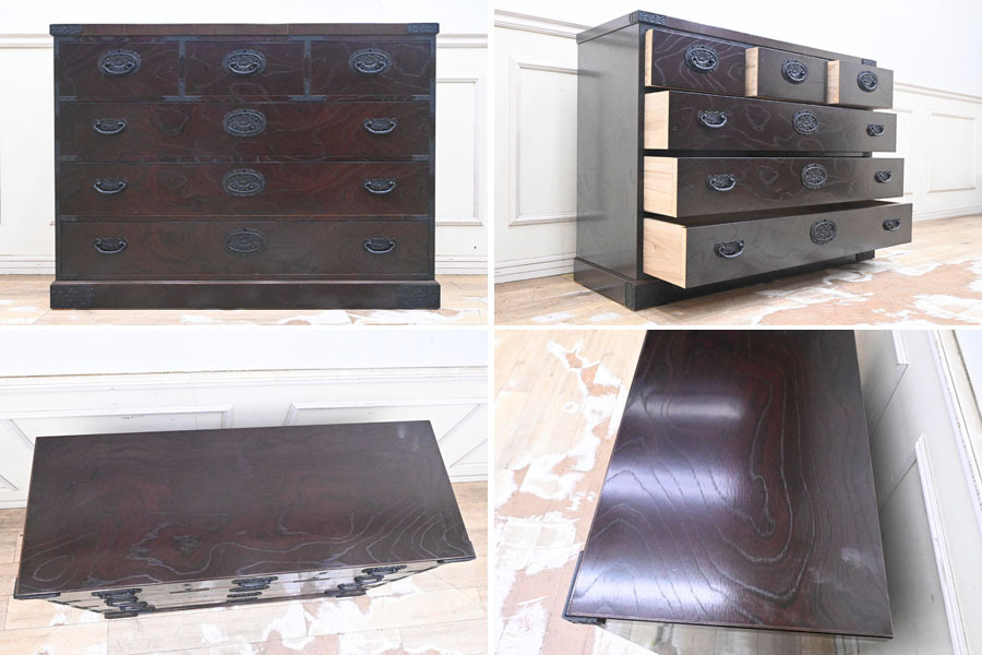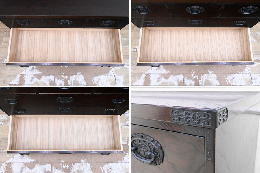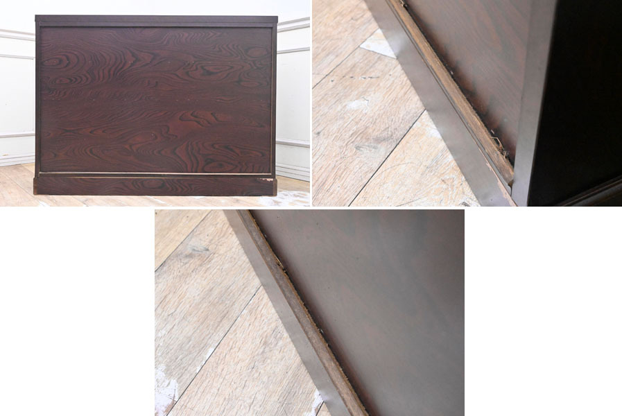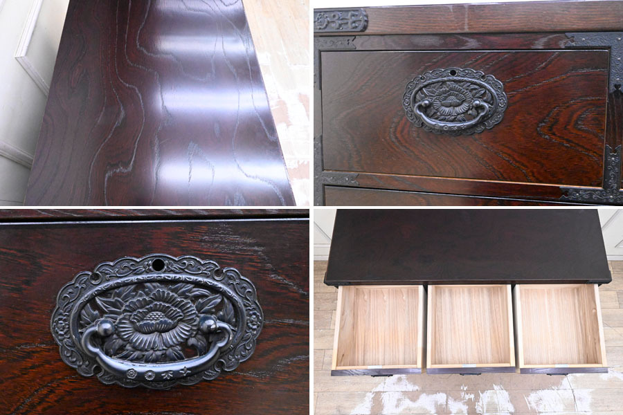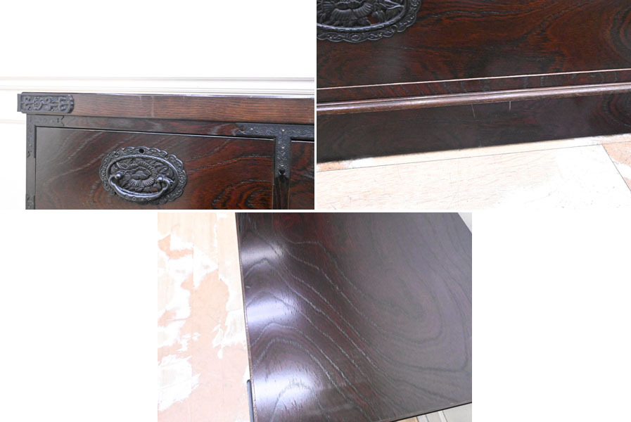 ----------------------------------------------------------------------------------------- ●送料や注意事項は必ずご確認下さい。落札後にトラブルになるケースが増えております。● ◆コンディションは写真・文章にて記載して有りますが、全てのキズの写真は掲載致しておりません。大きなダメージを除き見落とし、記載漏れが有る事はご了承下さい。 ◆当サイトにて出品する商品は多種多彩で、当方商品知識の無い物も多数ありますので落札後の質問やメンテナンス等にはお答えできません。 ◆入札された時点で、画像、文章をご理解していただいたものと判断させていただきます。不明な点は前もってQ&Aからお願い致します。入札後の質問やお電話等でのキャンセルは一切受け付け致しません。 ◆商品説明に「ノークレーム」と記載しているものに関しては、如何なる状況で届いても保証致しません。詳しくは注意事項の「商品到着後について」の最後に記載しておりますのでご確認下さい。 ---------------------------------------------------------------------------------------- 中古品ですのでキズ、ダコン、ヨゴレ、金具塗装剥がれ、天板縁にキズ、ダコン、引出内使用臭、天板表面波打ち、白くなっている部分、後ろ下部フレーム湿気を擦ったのか?膨らんでいる所有ります。 鍵は有りません。 幅120.5 奥45 高88.5cm | ||