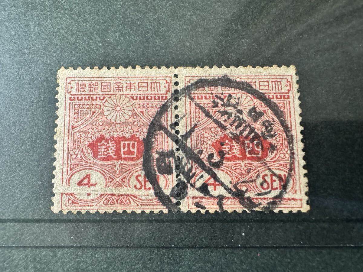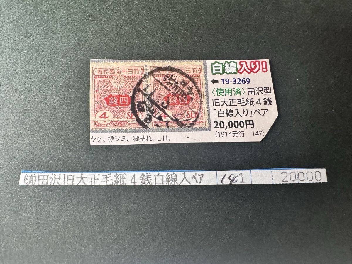 購入2万円 田沢型 旧大正毛紙 4銭 白線入り ペア 1914年 発行 使用済み 切手 希少