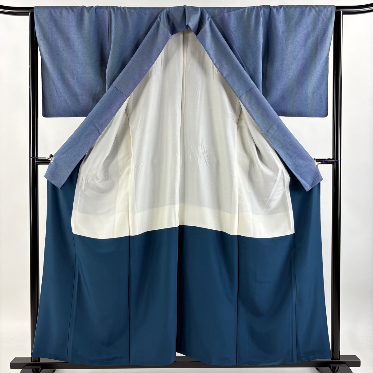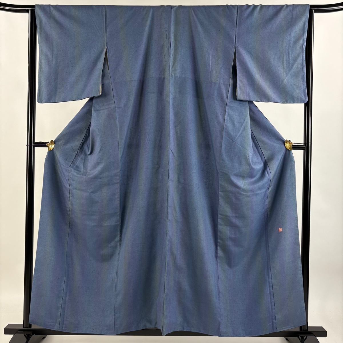 | 小紋 秀品 紬地 縦縞 ぼかし 青灰色 袷 身丈158 裄丈64 M 正絹 【中古】 |