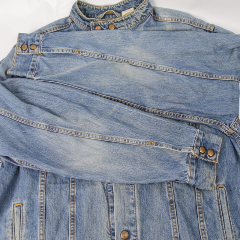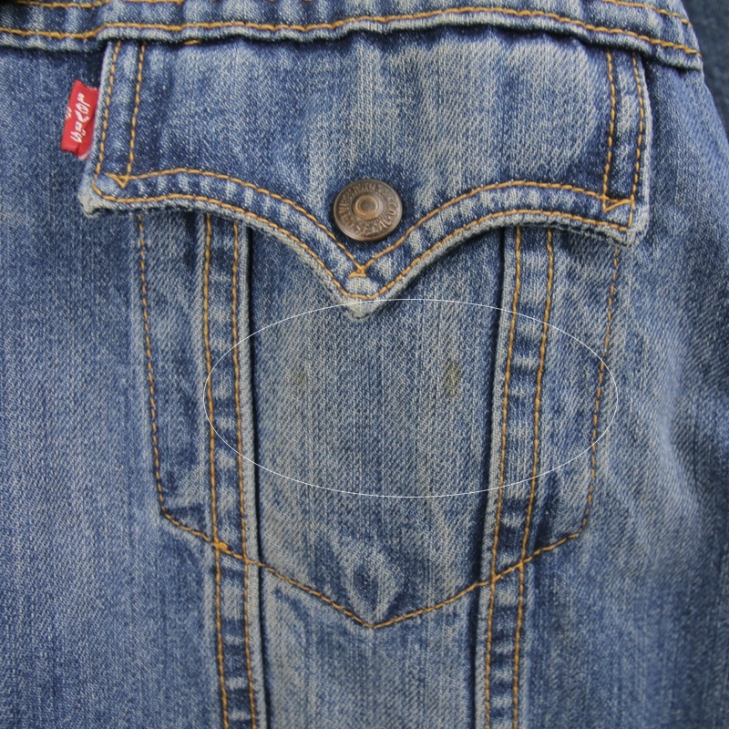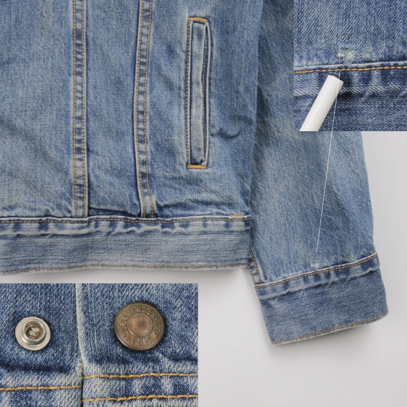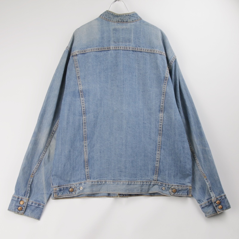 全体的にきばみ、イエローっぽいです。フロント、肩、袖などの色落ちムラありますが、縦落ち生地で、雰囲気あります。