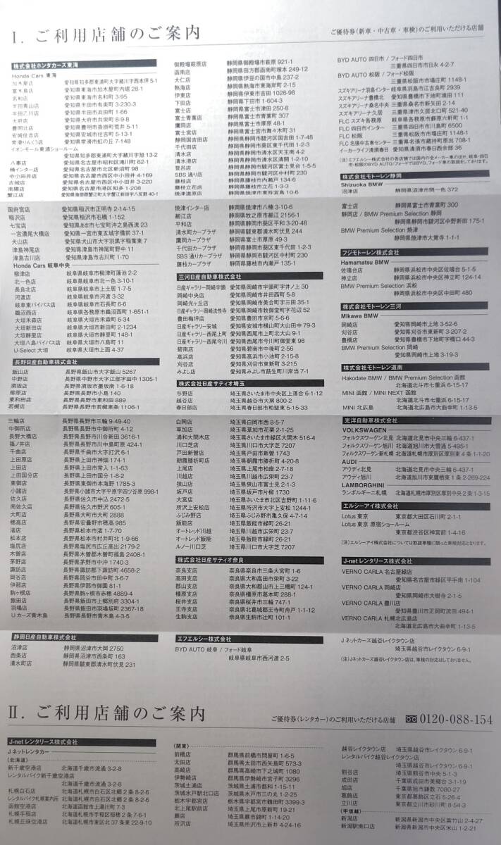 ホンダカーズ東海、長野・静岡・三河日産、日産サティオ埼玉・奈良の各店舗で使用できる割引券の他、Jネットレンタカーの割引券や、KeePerラボの20%割引券がセットになっています。
