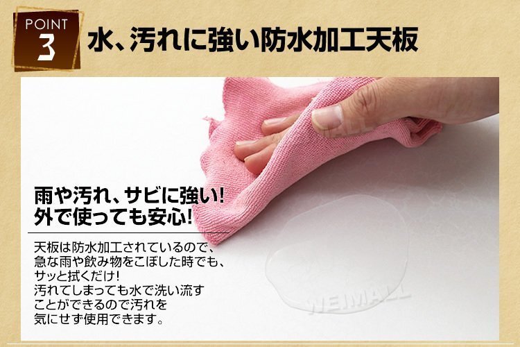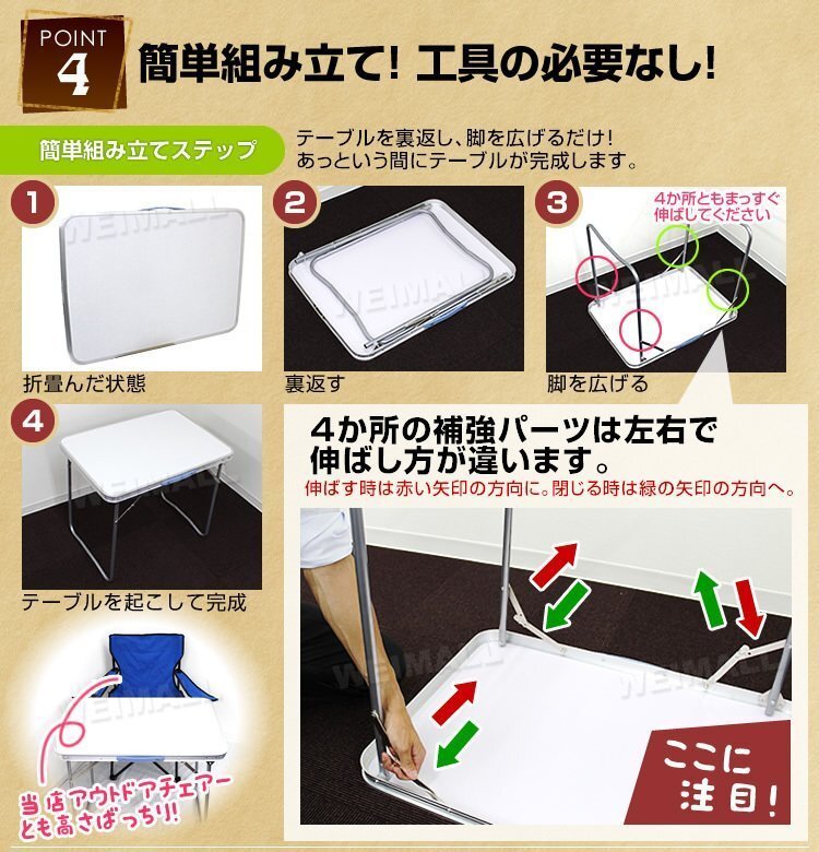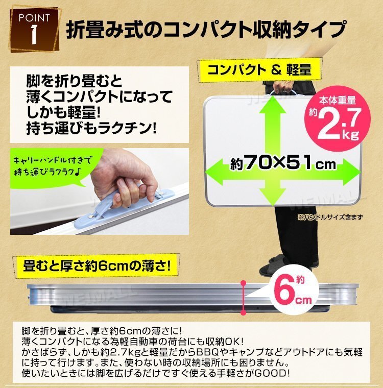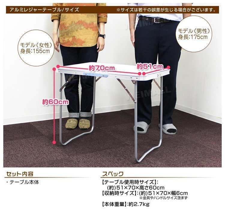 | テーブルとチェアが一つになった折り畳み式ピクニックテーブルです。 コンパクトに収納できて持ちやすい取っ手付きですので、持ち運びもラクラクです♪ サビに強いアルミを使用! 天板には防水加工が施されています。 組み立てはとっても簡単! 組み立ての際にもしまう際にも工具の使用は一切なし。 椅子を引き出すだけなので男女問わずに簡単設置。 天板中心部にはパラソル用ホールがあるので、ベランダやテラスでの使用にもおススメです♪ ピクニックやキャンプ、バーベキュー、運動会にもってこいの商品です。 【商品仕様】 ・折りたたみ式 ・テーブルサイズ(約):幅70cm×奥行51cm×高さ59cm ・カラー:ホワイト ・収納サイズ(約):幅70cm×奥行6cm×高さ51cm ・耐荷重(約):20kg ・重量(約):2.6kg ・材質:アルミ、MDF(耐熱・耐水加工)、ポリエステル、スチール 【注意事項】 ・海外製品で、簡易梱包での輸入のため風防に擦れや多少の小キズなどがある場合がございますが、商品自体には問題ありませんのでご了承下さい。 ・商品は、モニターによって色合いが異なって見える場合があります。 ・仕様・デザインは改良のため予告なく変更することがあります。 【もちろん新品未使用品です】 |