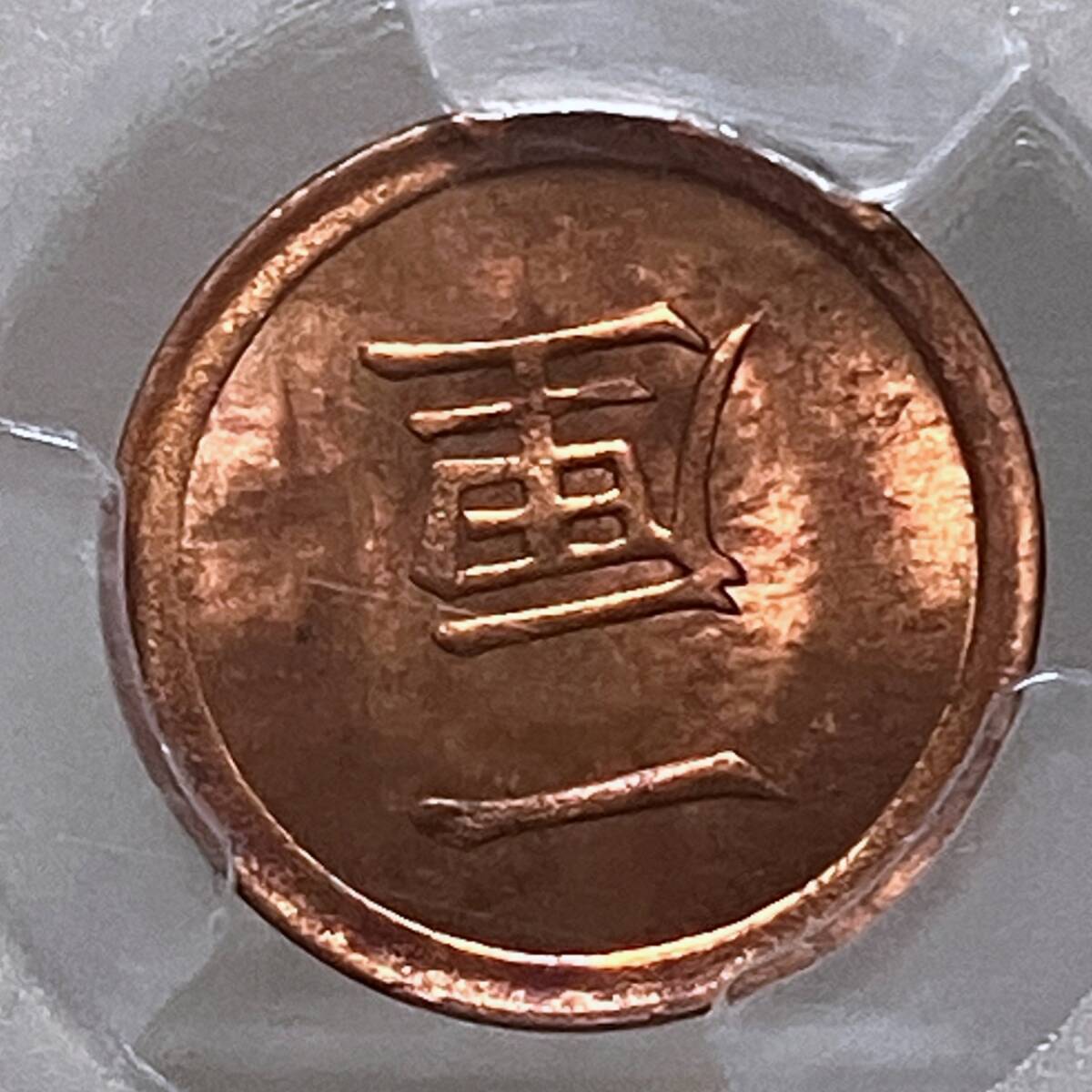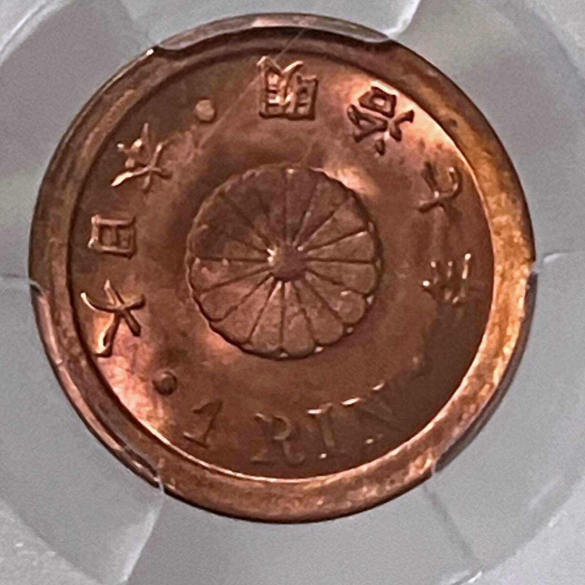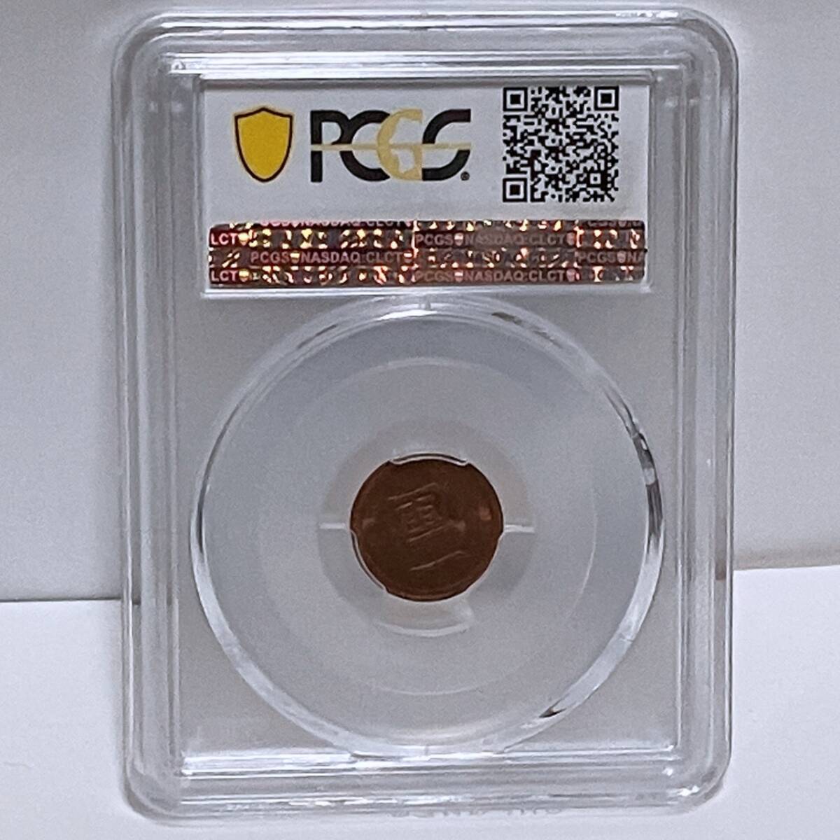 こちらはPCGSのケースに入った一厘の銅貨です。状態もよくに日本貨幣カタログの記載未使用より状態がいいMS65RDです。