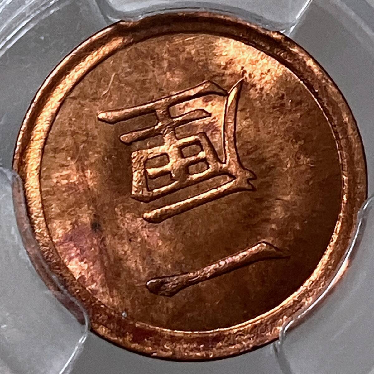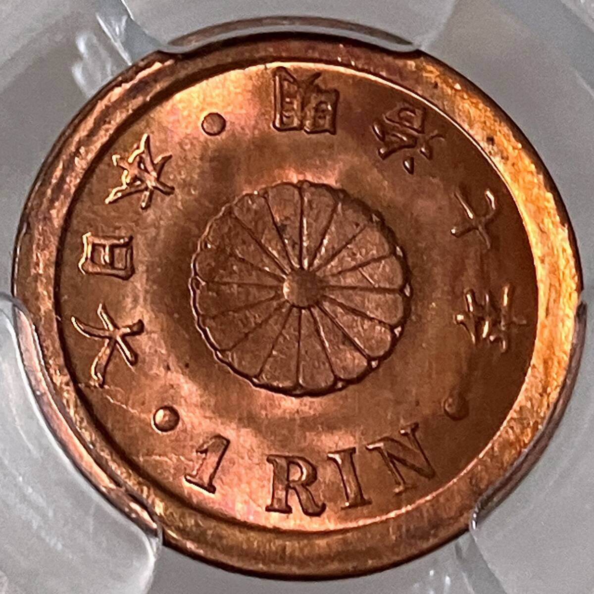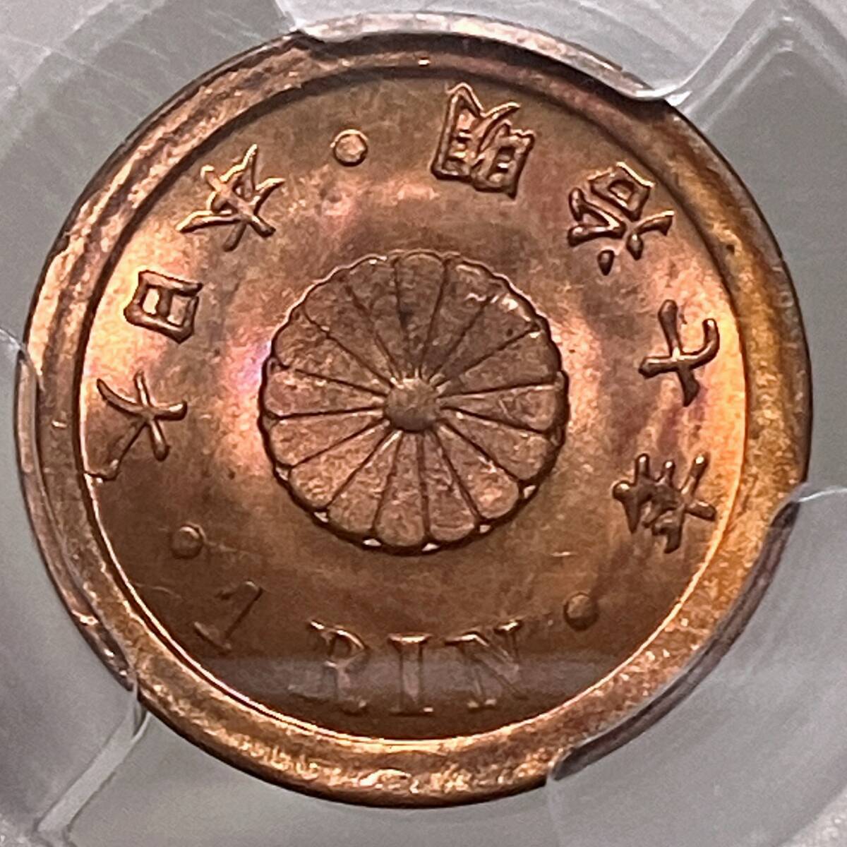 こちらはPCGSのケースに入った一厘の銅貨です。状態もよくに日本貨幣カタログの記載未使用より状態がいいMS65RDです。