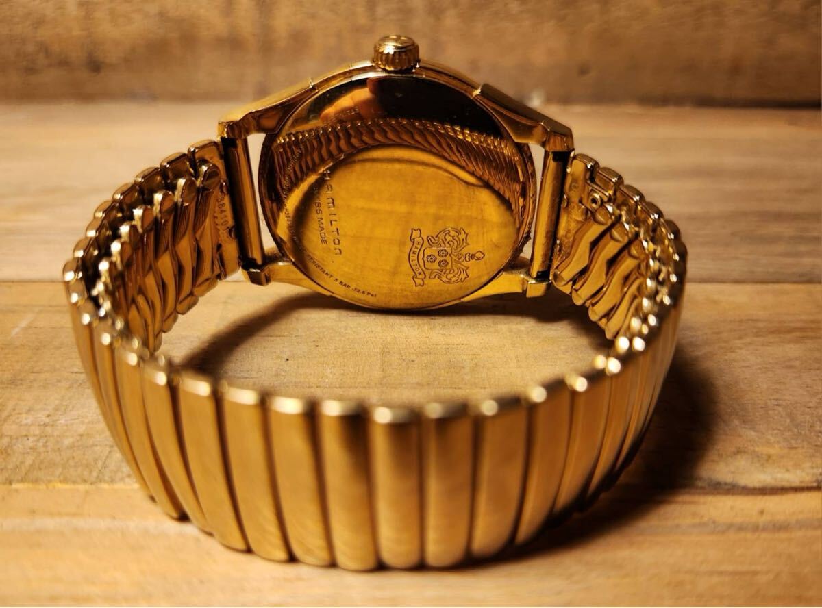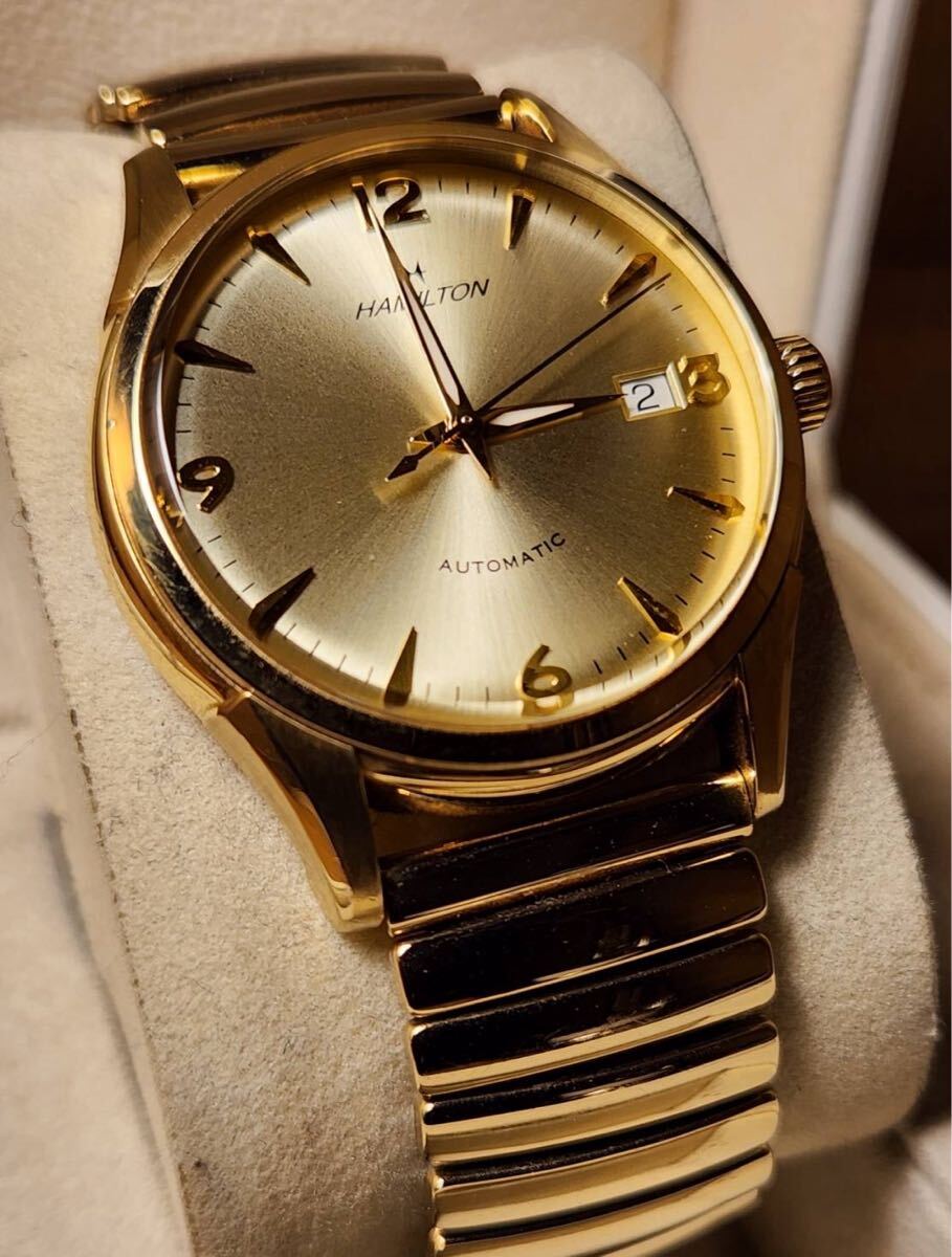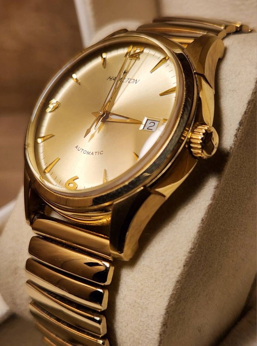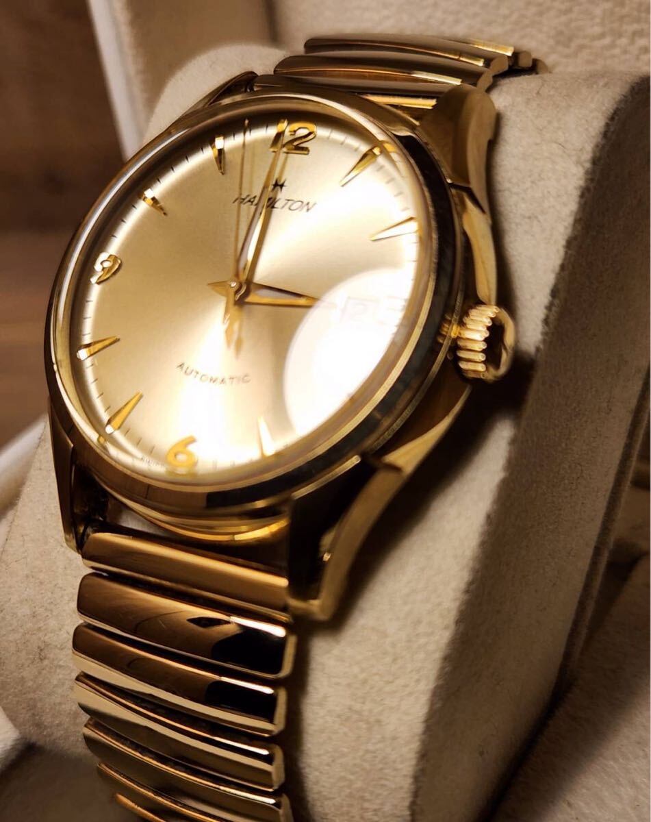 写真のモデルはダイアルにシャンパンゴールドを採用しているが、これは1940年代に"ハミルトンゴールド"と呼ばれていた同社の伝統色です。