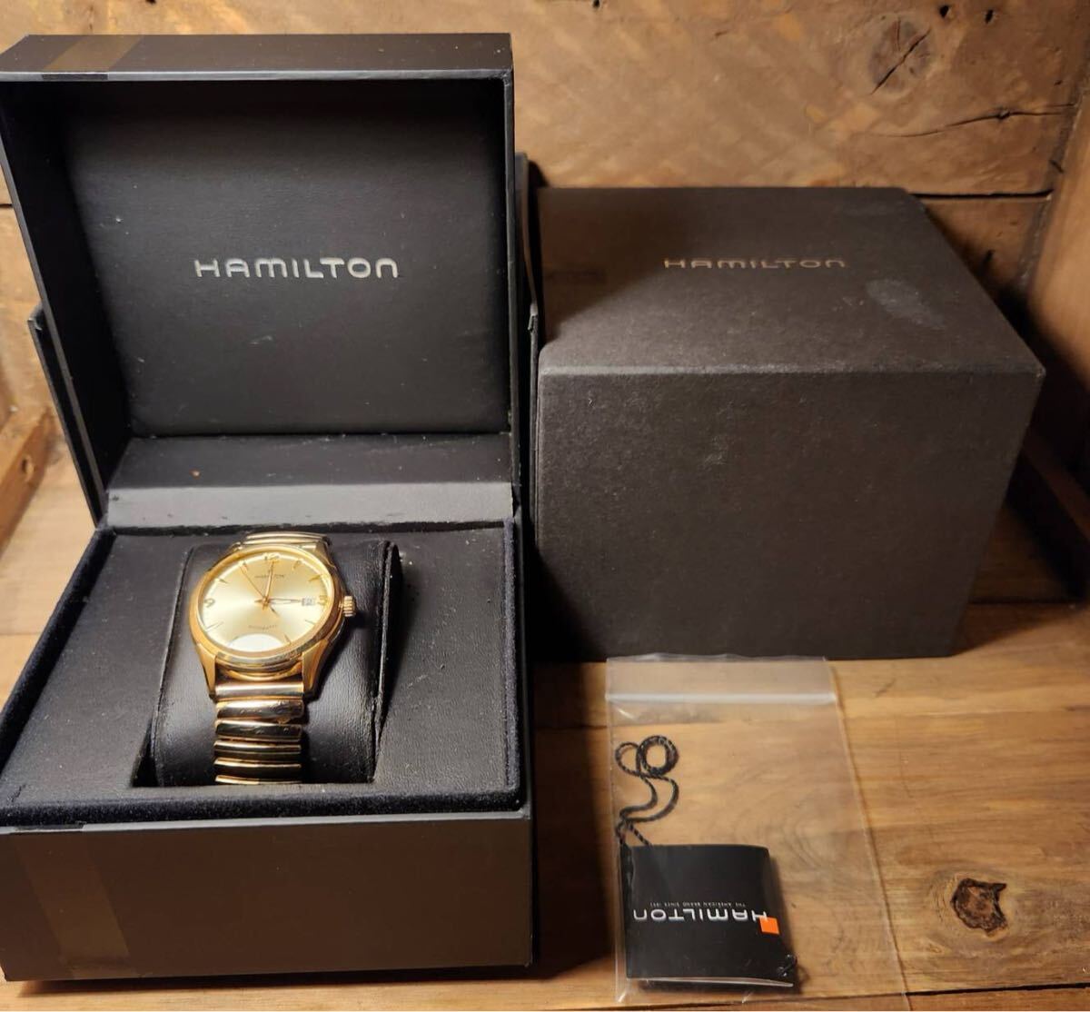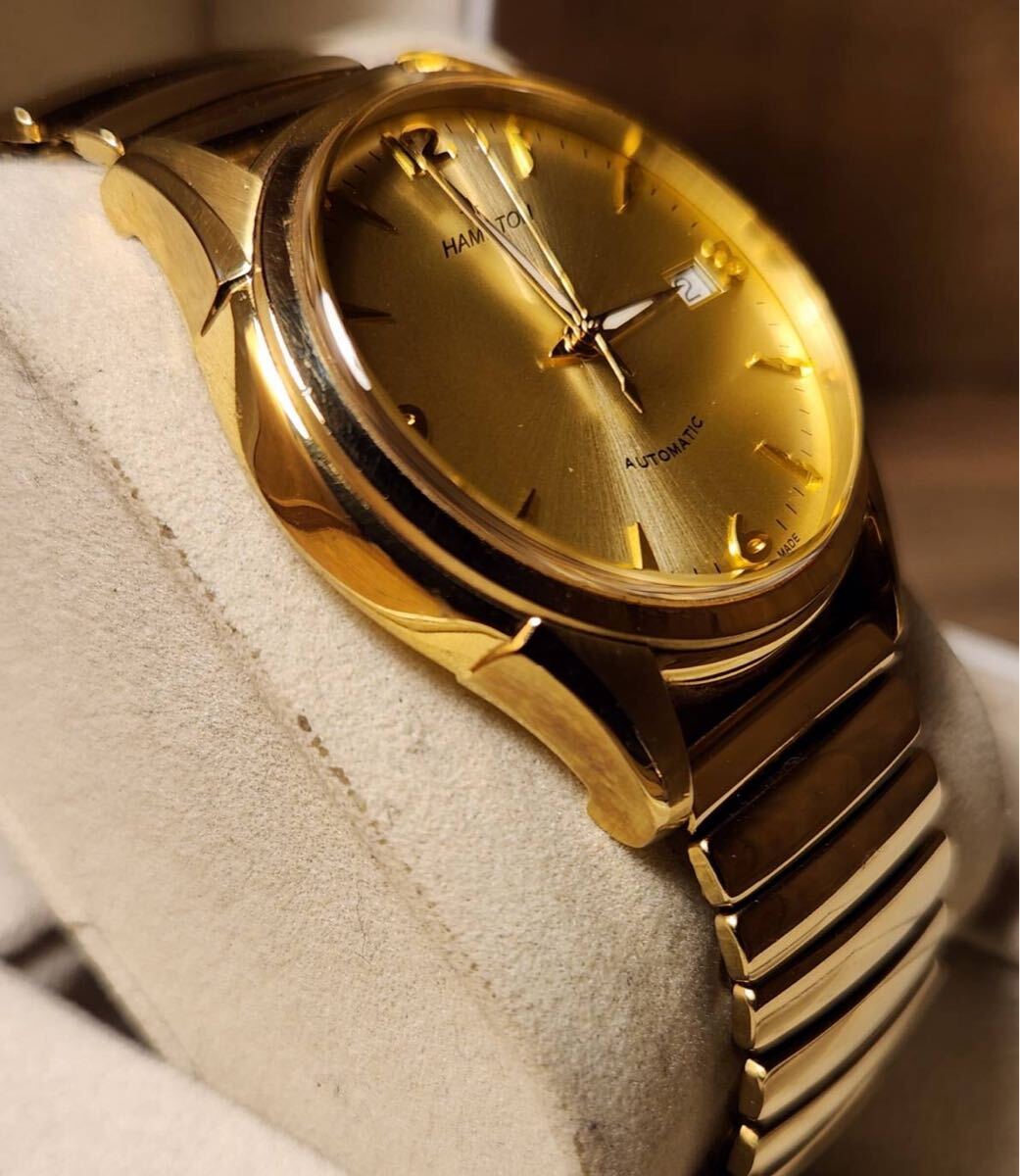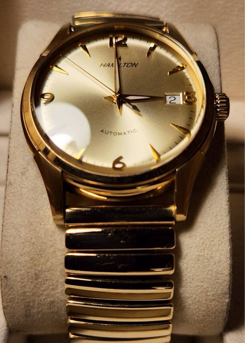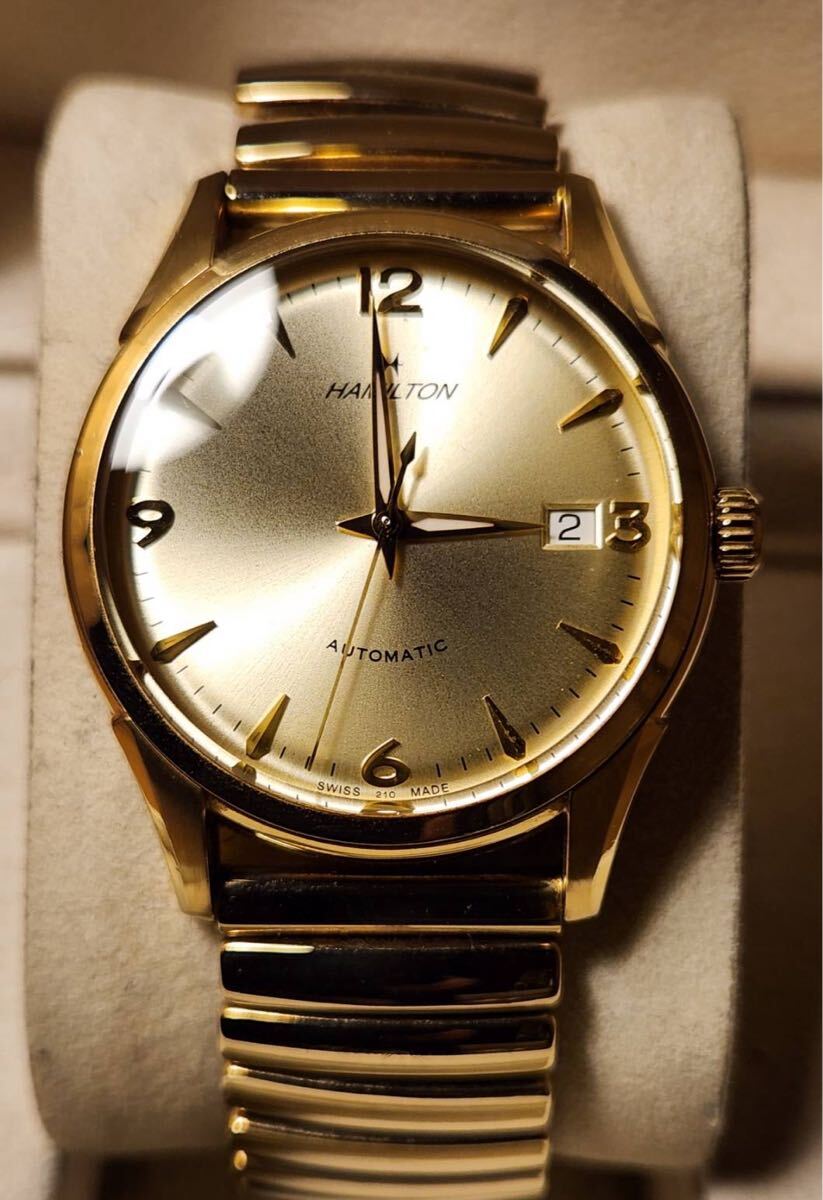 写真のモデルはダイアルにシャンパンゴールドを採用しているが、これは1940年代に"ハミルトンゴールド"と呼ばれていた同社の伝統色です。