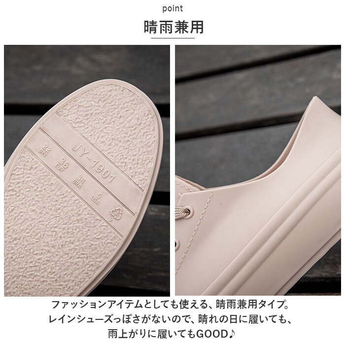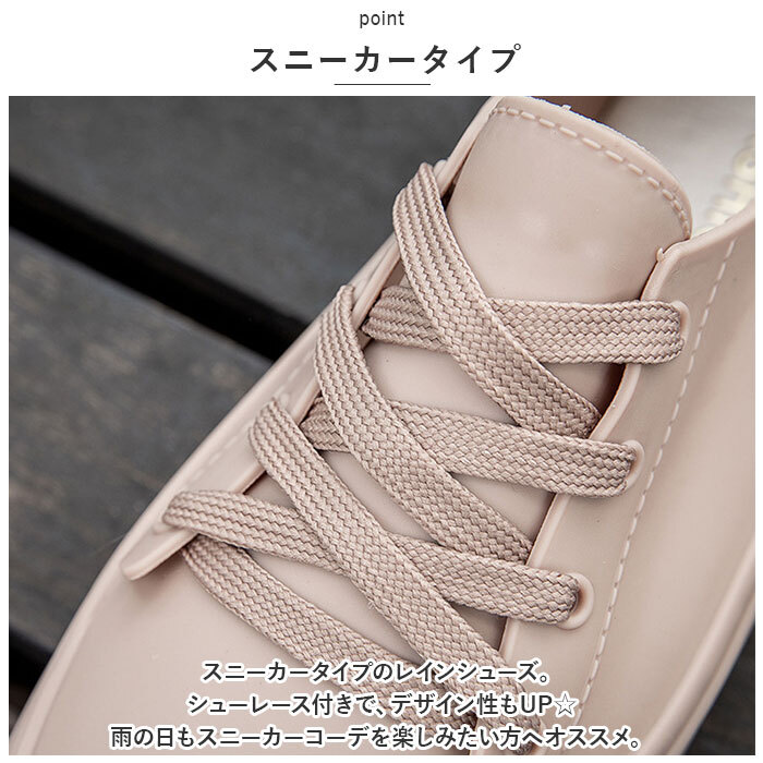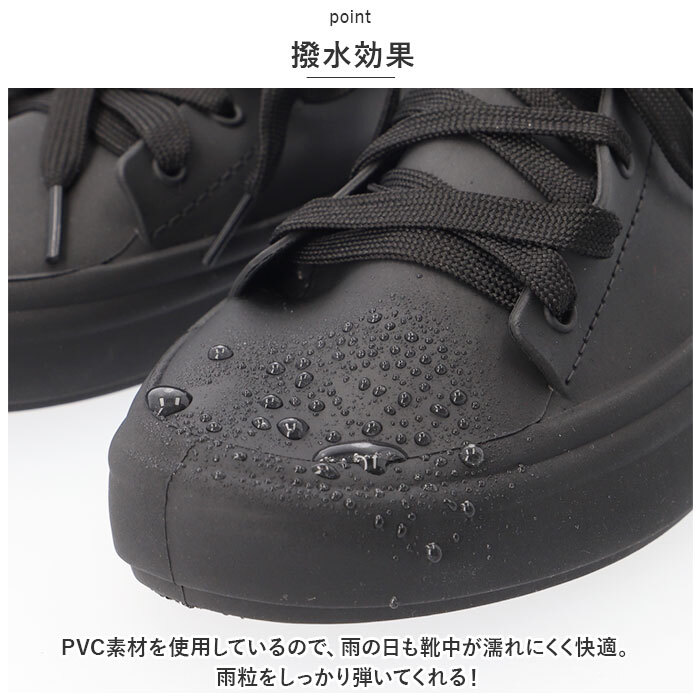 | 商品説明 | ・・まるでスニーカーみたいな、レインシューズが登場! ・【スニーカータイプ】 ・スニーカータイプのレインシューズ。シューレース付きで、デザイン性もUP☆雨の日もスニーカーコーデを楽しみたい方へオススメ。 ・【晴雨兼用】 ・ファッションアイテムとしても使える、晴雨兼用タイプ。レインシューズっぽさがないので、晴れの日に履いても、雨上がりに履いてもGOOD♪ ・【撥水効果】 ・PVC素材を使用しているので、雨の日も靴中が濡れにくく快適。雨粒をしっかり弾いてくれる! ・【ワンカラー仕上げ】 ・シューレースと靴をワンカラーで仕上げた、シンプルさが魅力。統一感があるのでスタイリッシュな印象。 ・【様々なシーンで】 ・雨の日の通勤通学はもちろん、ガーデニングやアウトドアなど様々なシーンで使える! ・【選べるカラー】 ・肌なじみの良いカラーバリエーション。どの色もお洋服に合わせやすい♪お好みをチョイス! |