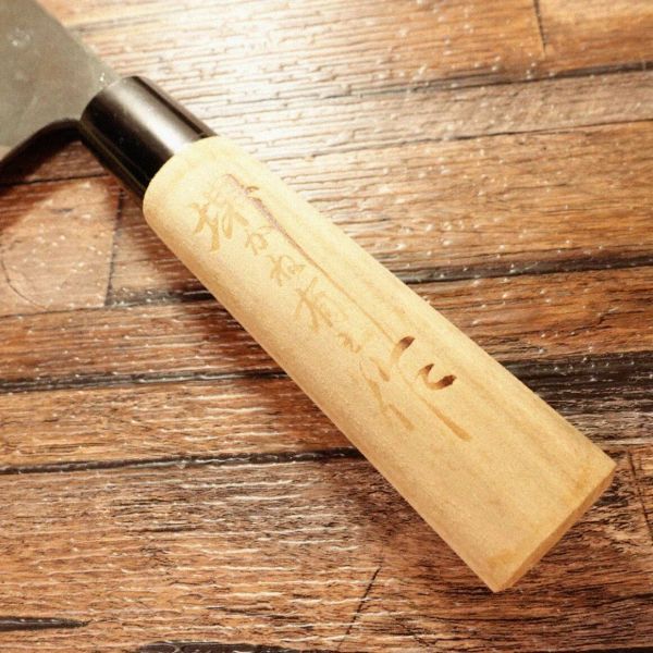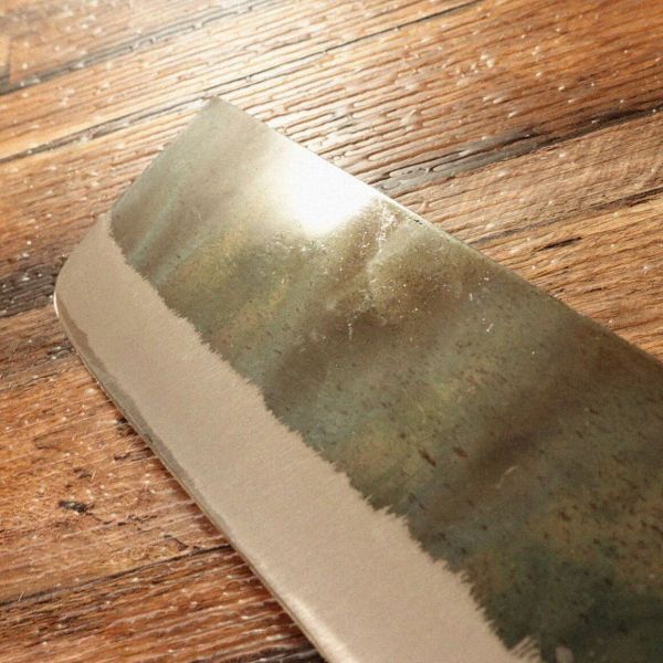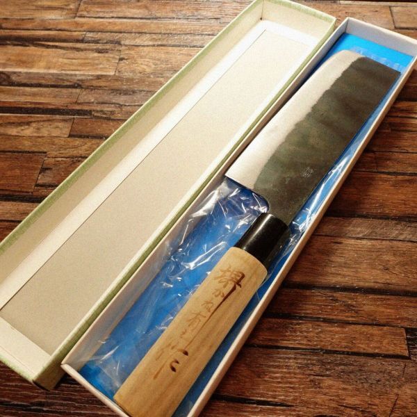 菜切包丁は、両刃で野菜の直線的な切断に適した和包丁です。このお品は黒打ち仕上げが施され、堺かね有の特製として作られたものです。