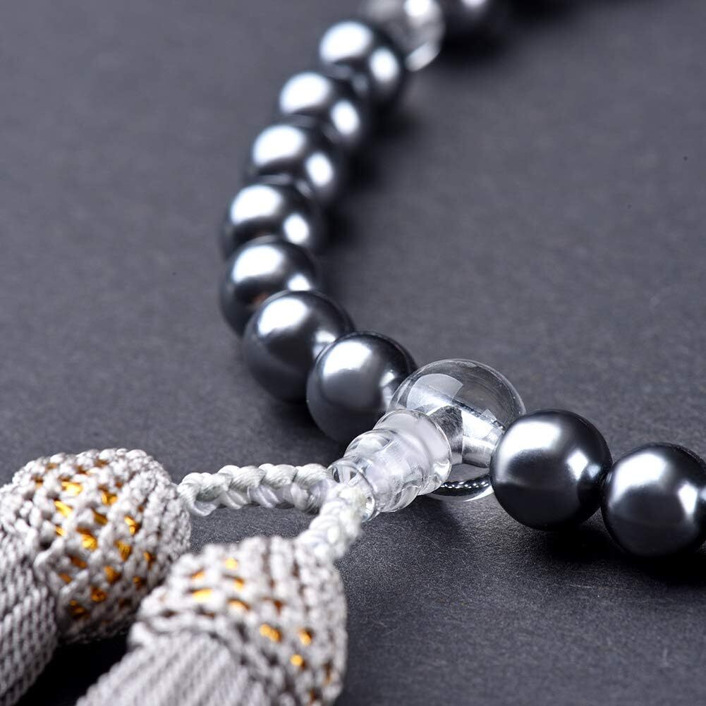 石の効力  真珠(パール) パールが「美と健康」の秘薬として用いられ、クレオパトラがパールを飲み干した伝説は有 名です。美や若返りのお守りに最 適です。また、母貝の防衛手段から生まれたもののため、強い保護力があり、悪霊から身を守ってくれるそうです。また、お産を軽くする効 果もあるそうです。 本水晶 あらゆる場面、あらゆる場所、あらゆる事象に対応する万 能のパワーストーンといわれています。潜在的な能 力やパワーを呼び覚まし、目覚めさせてくれるそうです。人類にこれほど愛され、ヒーリングストーンとして伝統的に用いられてきた鉱物は他にありません。古来より、浄化、活性化、潜在能力の開発、魔よけ、霊性の向 上など、あらゆる効力で知られ、宗教や呪術の道具として用いられてきました。実は、水晶は日本の国石です。クリスタルの古い和名は「水精」で、古来から日本人の守護石として用いられてきました。これは、農耕民族であった日本人が、農作物をつかさどる水の霊「水精」の恩恵を必要としたからではないかと考えられています。     サイズ 約8ミリサイズ  素材 親玉:本水晶(約12ミリ) 主玉:黒貝パール(約8ミリ) 天玉:本水晶(約6ミリ)  房 房デザイン→正絹頭付房 房色→灰色     【宗派】: すべての宗派のお客様にお使い頂ける女性用のお数珠でございます。素材は、美しい淡水パールでございます。アクセントには水晶を使用させて頂きました。本真珠は、どうしても高価になりますが、今回ご紹介す淡水パール、玉の大きさも約8ミリございまして、十分なボリューム感でございます。房も、もちろん正絹製でございます。     【付属品】: マグネット式数珠袋をお付け致します。