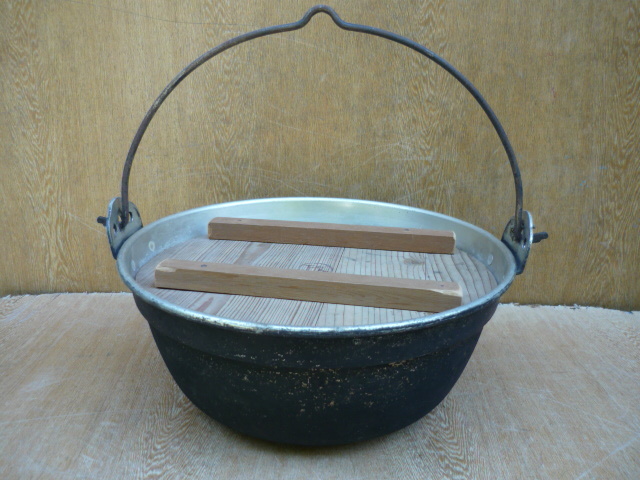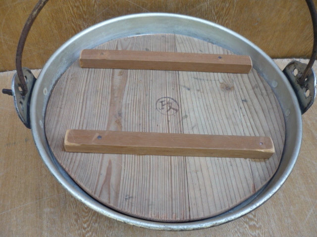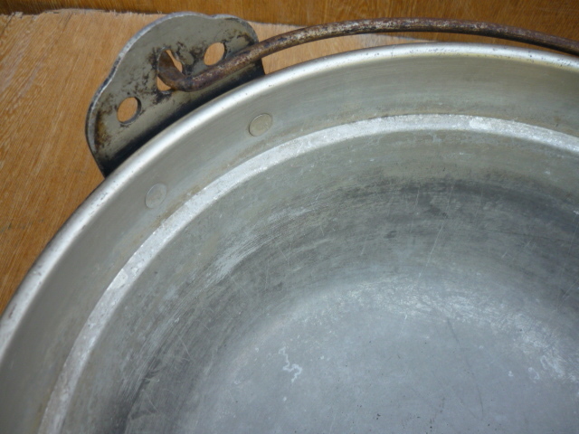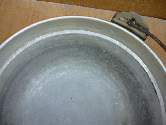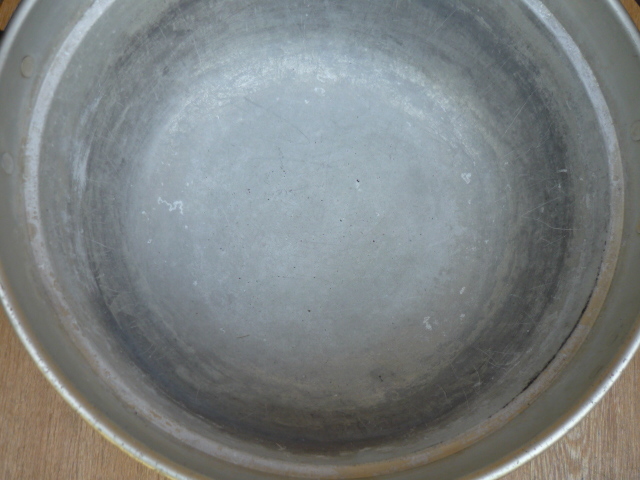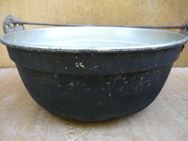アルミ鍋 (本体)直径34.5cmx高さ≒14cm 洗浄殺菌消毒済みです。機能状態に問題はありませんが、鍋底には焦げあとが残っていて,蓋も多少の補修加工がしてありますのでご了承ください。画像写真で状態をご確認の上ご判断ください。