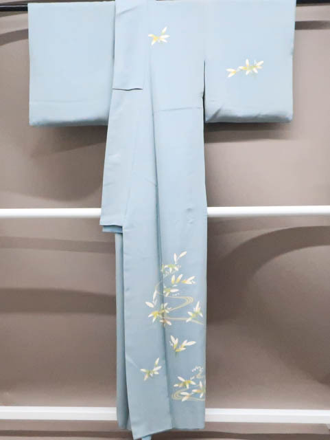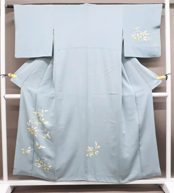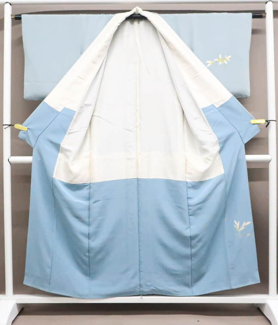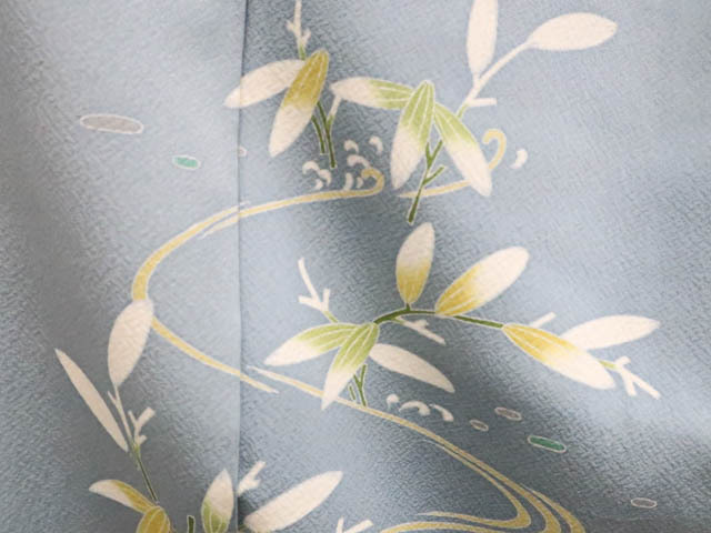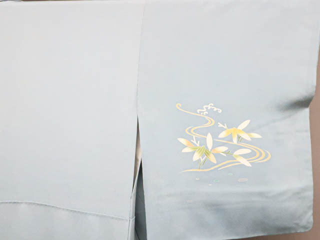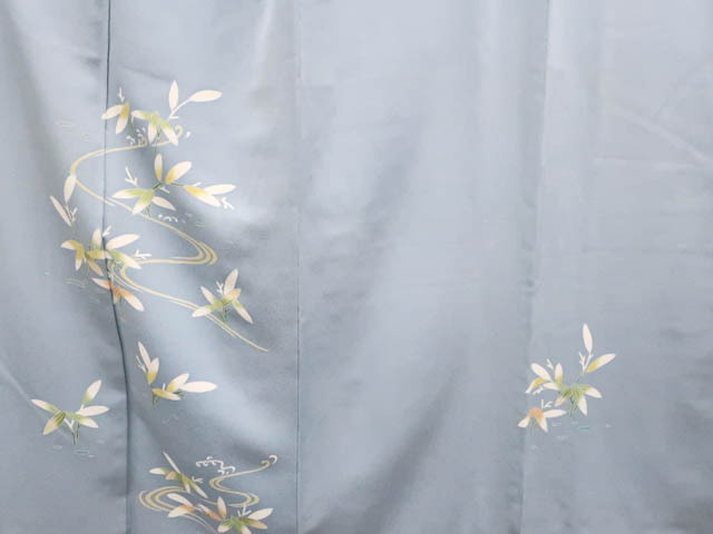 リサイクル商品のため、所々と両袖口にしみと衿に薄しみがございますが着用可能なお品です。 地色は 水灰です。 1枚目の画像が近いお色かと思われます。 素材は正絹です。 |