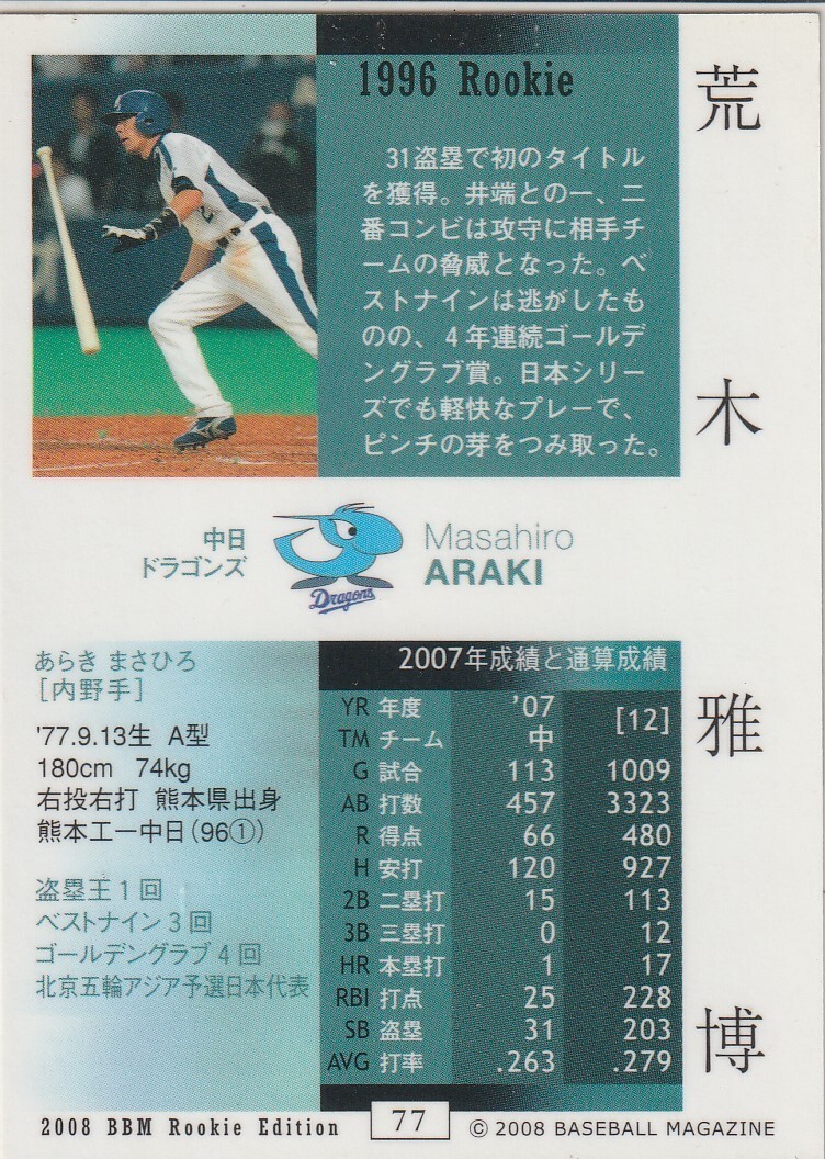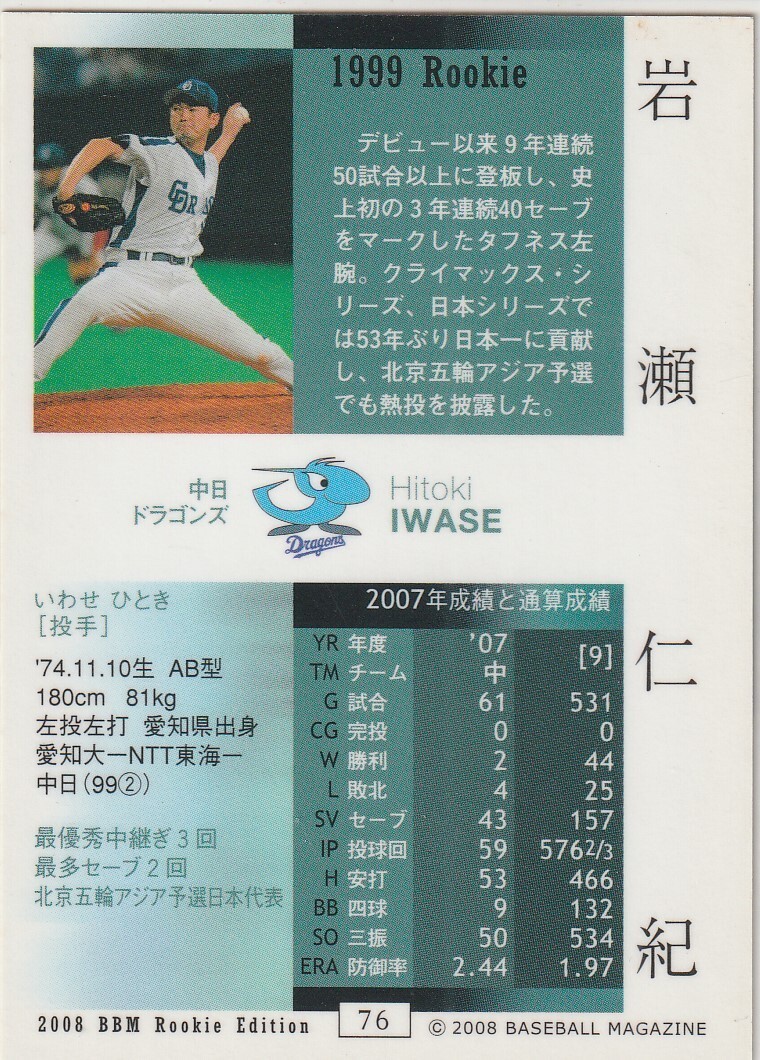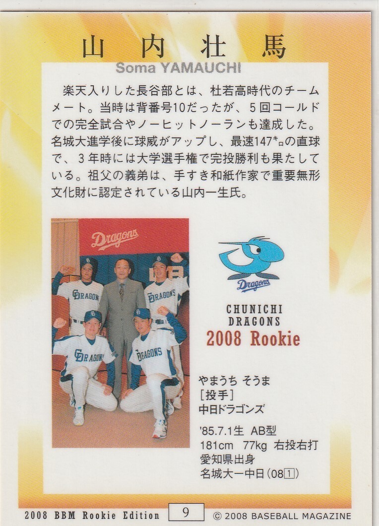 ●2008BBM/RE[ルーキー:山内/岩瀬,荒木]ルーキー&チームレギュラー3種:中日 R