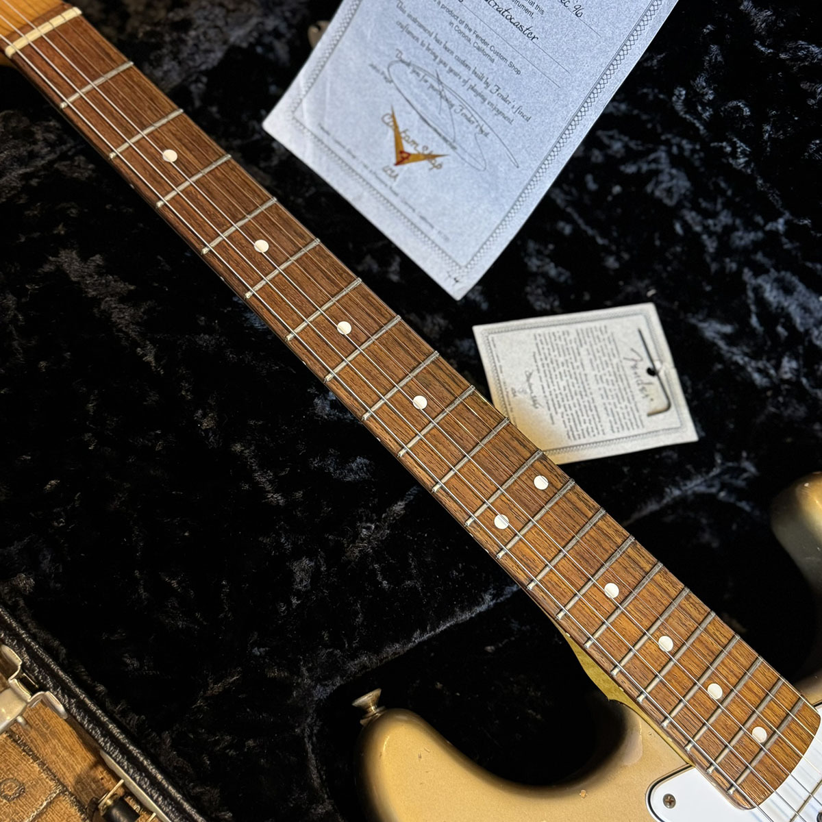 ピックガードは新たに作られたものに交換されており、ピックアップも近年製造のFender Custom Shop Fat 60sが搭載されております。