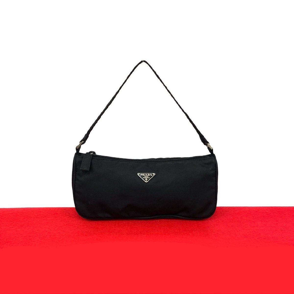 極 美品 希少品 PRADA プラダ 三角ロゴ シルバー 金具 プレート テスート ナイロン ミニ ハンドバッグ ポーチ ブラック 黒 09089