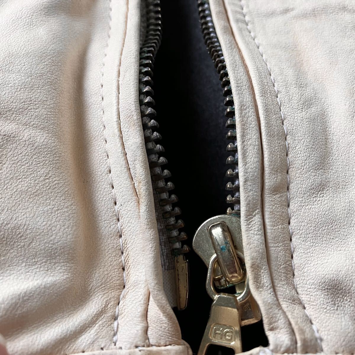 状態全体:所々に薄い変色と、ジッパーに少量の緑カビ、洗ったことによる革の乾燥で全体がパリっとしています。(油分と保湿のケアが出来る方におすすめです)