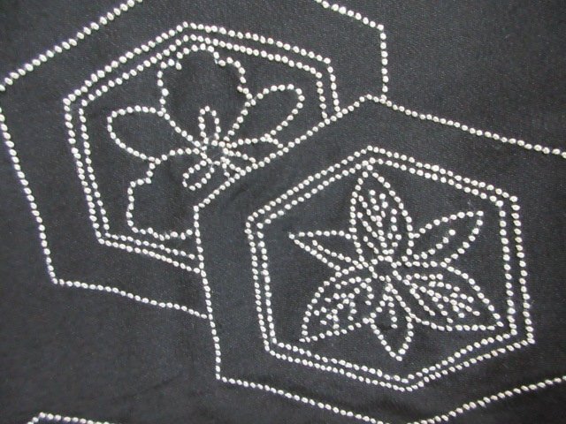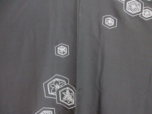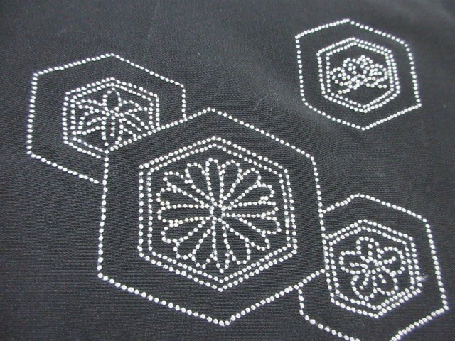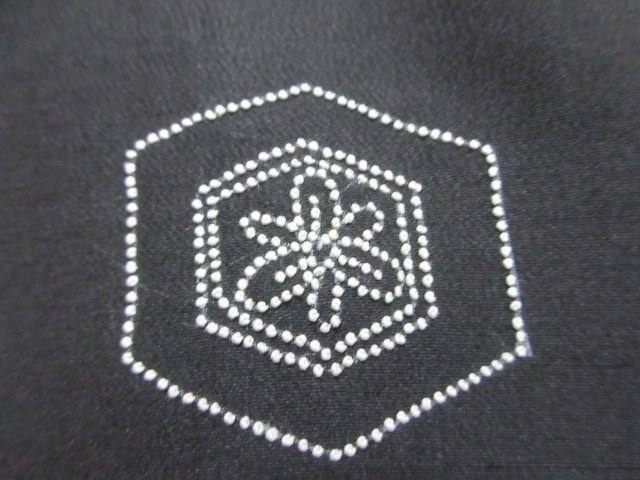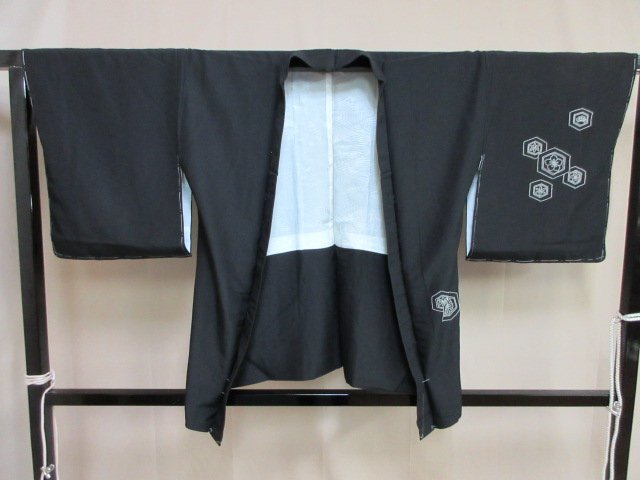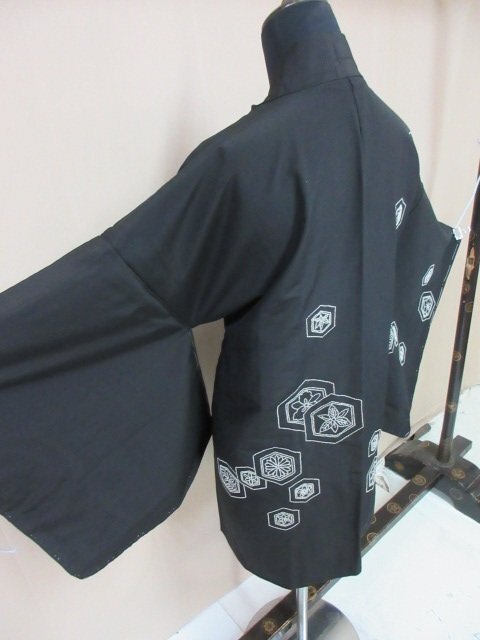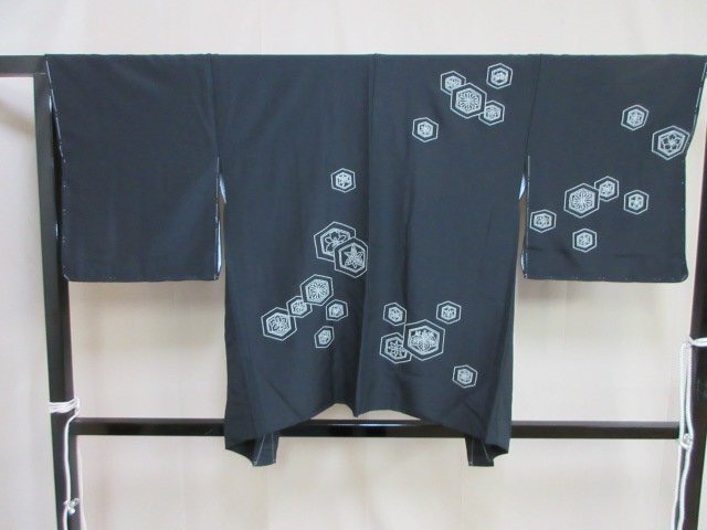 商品名 | 1円 中古 羽織 正絹 和装コート 縮緬 黒 紋なし 亀甲 草花 仕立て糸付 おしゃれ 高級 袷 身丈77cm 裄68cm【夢職】★ |
