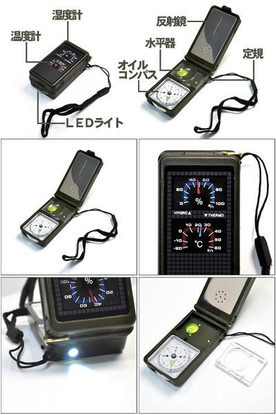 商品説明 | 必要な機能が1つになって、サイズはコンパクト。 オイルコンパス、温度、湿度計、LEDライトや水平器も搭載した多機能コンパス。 キャンプや登山などアウトドアに必要な機能が1つになって、サイズはケータイより小さな手のひらサイズと、超コンパクト! 様々なシーンで役立ちます。 サイズ(約) W4.0×H2.5×D7.8cm 重量(約) 60g 電源 リチウムコイン電池CR1220×2(テスト用が付属しています) 別タイプのオイルコンパスなどはこちら |