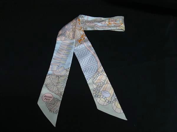 1円 HERMES エルメス De l'Ombrelle aux Duels Vieux【杖傘と決闘】ツイリー シルク100% リボンスカーフ ライトブルー系 FP6420