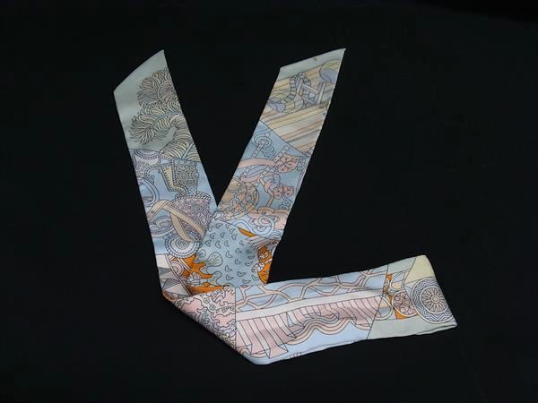 1円 HERMES エルメス De l’Ombrelle aux Duels Vieux【杖傘と決闘】ツイリー シルク100% リボンスカーフ ライトブルー系 FP6420