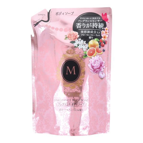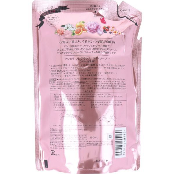 心地よい香りとうるおいつや肌の毎日を マシェリ独自のフレグランスセンサー機能で不快なにおいを心地よい香りにするボディソープ 甘くさわやかなフローラルフルーティの香りが持続します 植物由来の石けん成分配合 うるおい成分濃密パールハニージュレBX配合でうるおいつや肌に仕上げます ノンシリコン/アルコールフリー/鉱物油フリー/パラベンフリー/着色料フリー/サルフェート系洗浄剤フリー ボトル横の縦ラインがボディ洗浄料のしるしです ※詰替用 【商品詳細】 個装サイズ:145mmX220mmX60mm 個装重量:約374g 内容量:350mL 成分:水、PG、ラウリン酸、ミリスチン酸、水酸化K、パルミチン酸、香料、コカミドDEA、ラウリルグリコール酢酸Na、ポリクオタニウム-39、ハチミツ、セリシン、ヒアルロン酸Na、加水分解コンキオリン、ココアンホ酢酸Na、ヒドロキシプロピルメチルセルロース、EDTA-3Na、ピロ亜硫酸Na、EDTA-4Na、BG、ソルビン酸K、クエン酸、安息香酸Na 製造国:日本 発売元:株式会社ファイントゥデイ JANコード:4550516494160 |