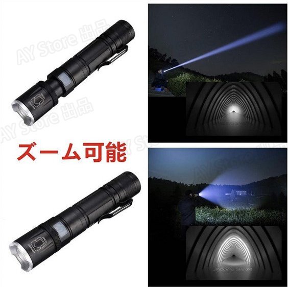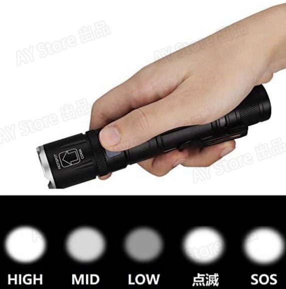 1、小型、高輝度:最新のXHP50.2 四核LED使用、4つ独立ledの集合からなり、輝度が高く、照射角度がもっと広いです。 これらのいずれかのled破損しでも、他のled使用に影響を与えることはなく、輝度、使用寿命ともに通常のledの4倍であるといえます。点光源テスト1500ルーメン、射線光源10000ルーメン+ /平方フィート。プッシュでズームでき、片手で操作することができます。(回転式ズームではありません。)照射範囲を任意に調整できます。光学凸レンズ集光:遠射200メートル、可視距離1000メートル(テストデータは天候の影響を受けます)。照明モードはスイッチで調整でき、5段階のモードは次のとおりです。HIGH、MID、LOW、点滅、SOS。スイッチを1秒間押し続けると、電源が切れます。