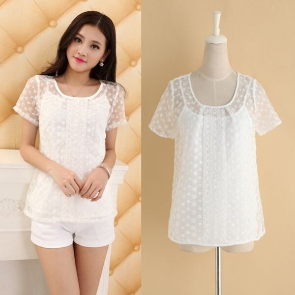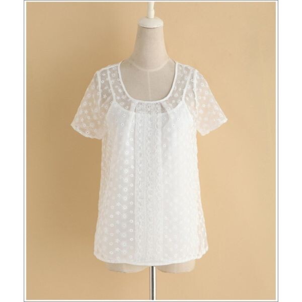 ブラウス 半袖 裏地付 ラウンドネック シフォン 透け感 レディース ホワイト S