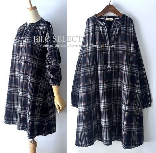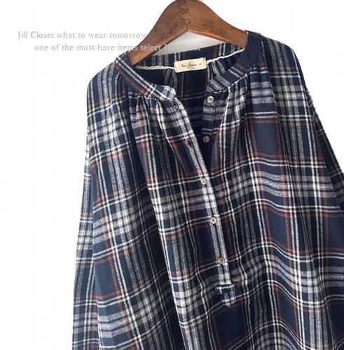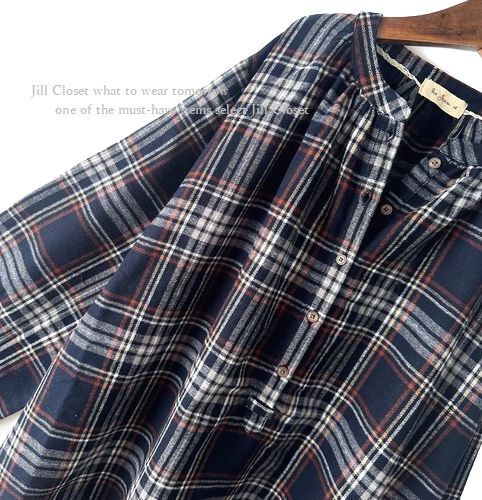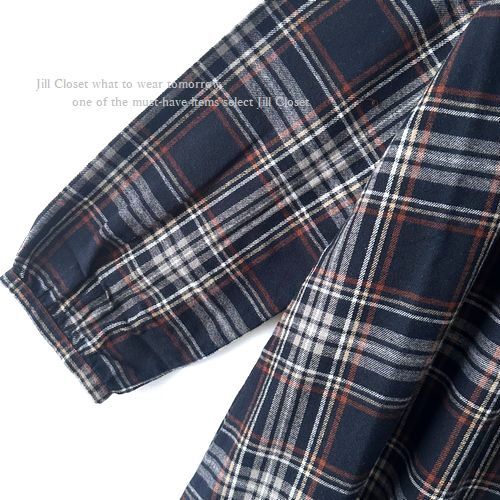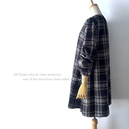 新品【送料185円】温かみのあるフランネル チェック柄*ナチュラル素材*胸元ボタン*ネルシャツ プルオーバー*チュニック*ワンピース7700.NV