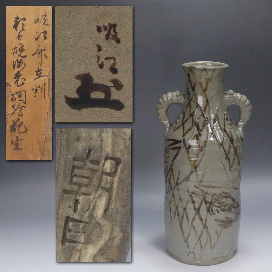 ■商品説明 下記、吸江斎の在判の入った、 江戸時代に製作された、 吸江斎 在判の入った古朝日焼 時代物 海老網海老耳 珍 花生です。 (高台縁内に「朝日」の銘が入っております。) 【 吸江斎 】 幕末の茶人。表千家十世。久田家七世宗也(表千家八世宗左の弟)の子。 名は達蔵・宗佐、別号に安祥軒・祥翁・宗旦。 8才で表千家に迎えられて十世を継ぎ住山楊甫の後見を受け、 10才で紀州徳川家に出仕し、時の藩主治宝から逆に台子真点前の皆伝を受けた。 のち利休二百五十回忌・如心齋百年忌・宗旦二百年忌等を営む。 好みの道具には溜二重棚・手付桐煙草盆等があった。 万延元年(1860)歿、43才。 《 朝日焼 》 京都府宇治市で焼かれる陶器。 宇治茶の栽培が盛んになるにつれ、茶の湯向けの陶器が焼かれるようになった。 江戸時代には遠州七窯の一つにも数えられている。 朝日焼という名前の由来については、 朝日山という山の麓で窯が開かれていたという説と、 朝日焼独特の赤い斑点(御本手)が旭光を思わせるという説がある。 ■寸 法 口径約6.0cm・高台径約10.5cm・高さ約27.0cm。 ■状 態 目立った傷は無く、状態の良い品です。 ■付 属 品 箱。 【即決・送料無料】の表示商品に限り、 一部地域(北海道・沖縄)を除き、送料無料キャンペーンを実施しております。 ご希望の方は、お早めに入札して頂けます様、宜しくお願い致します。 【※※なお、作品に対して疑問や質問がある場合には、※※】 質問欄もしくは、ストア情報に当方の情報が記載されておりますので、こちらをクリックしてお問い合わせ下さい。 宜しくお願い致します。 |